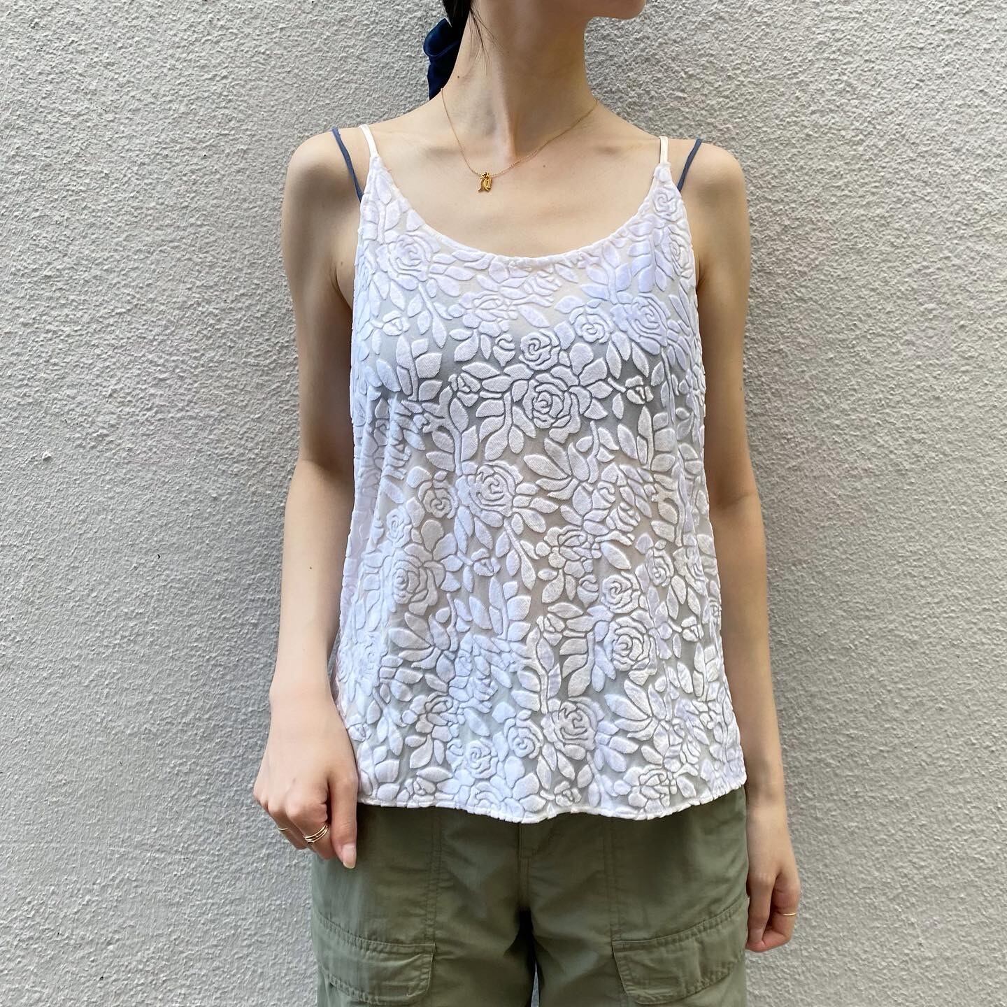 シアー生地にベロア素材の花柄が素敵なキャミソールです。1枚で着るのはもちろん、シャツやジャケットのインナーとしてもお召し頂けます。
