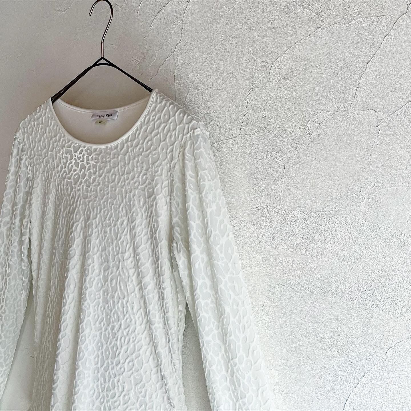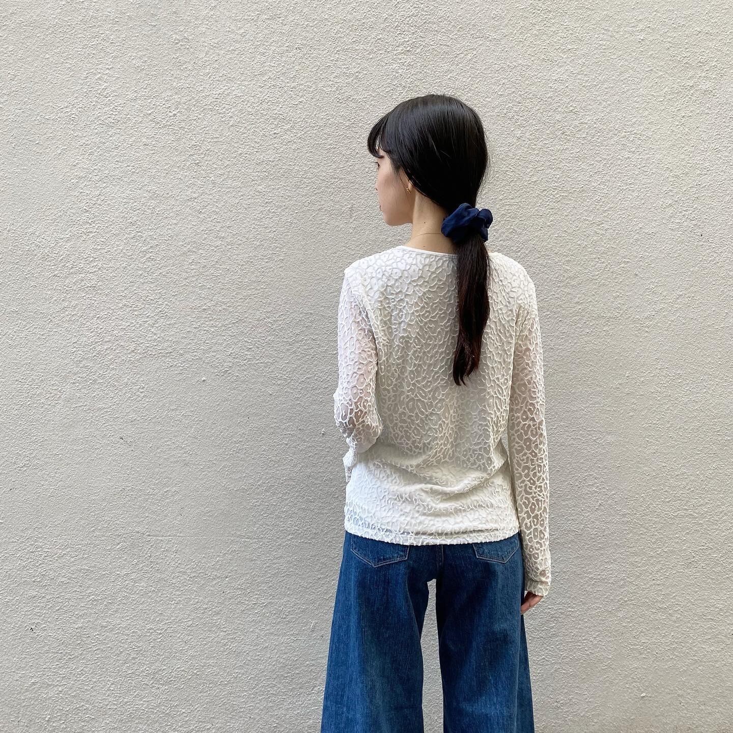 シアーに程よい光沢感のあるベロアが美しいトップスです。身頃の部分だけ生地感の違った布が重なっており、インナーが透けない仕様になっています。