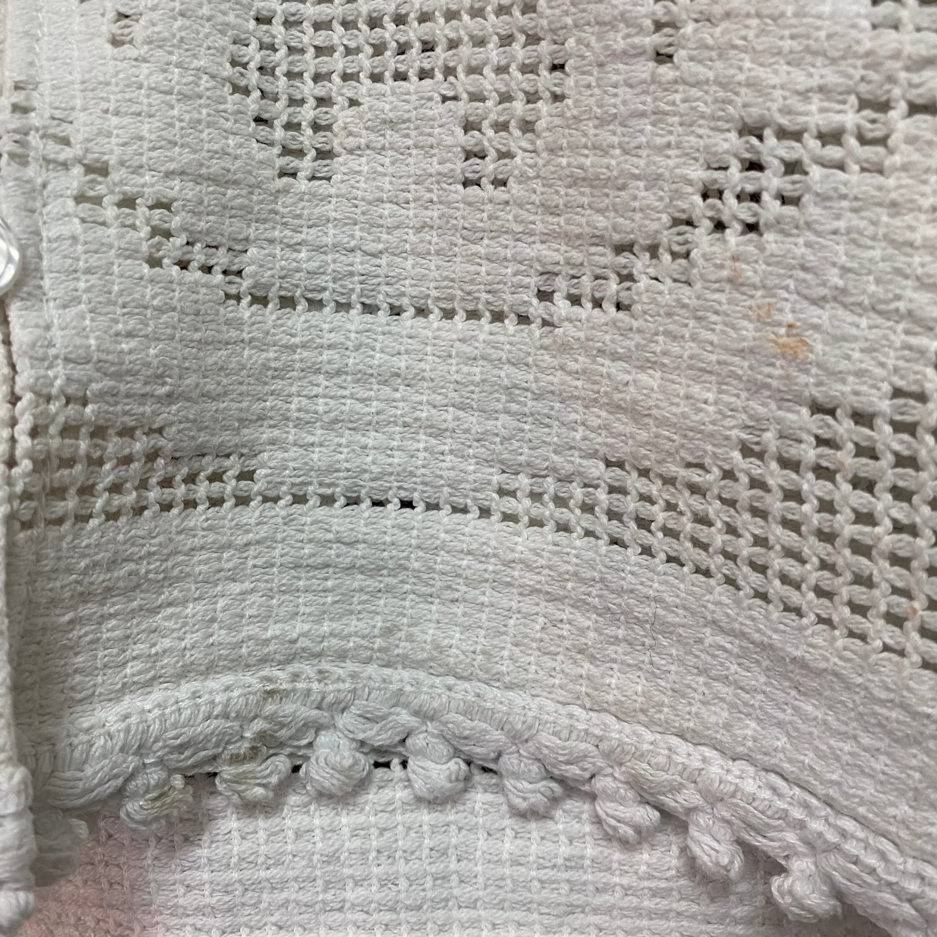 ヴィンテージのクロシェ生地を裁断し、ハンドメイドで作り上げられたジャケットです。裾や袖口のフリンジの様なデザインが素敵です。