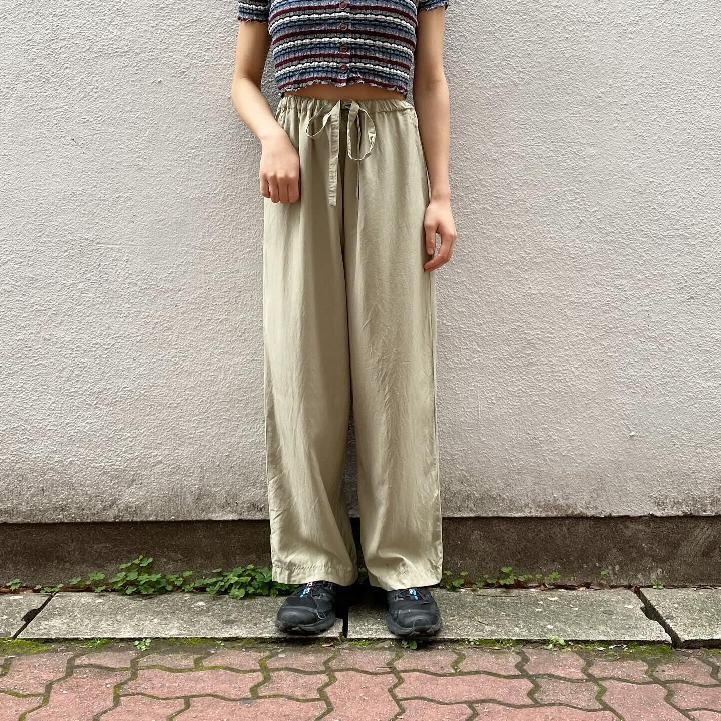 100%シルクのドライな生地感で軽い着心地のイージーパンツです。ウエストは紐で調節できるので、ラクにお召し頂けます。