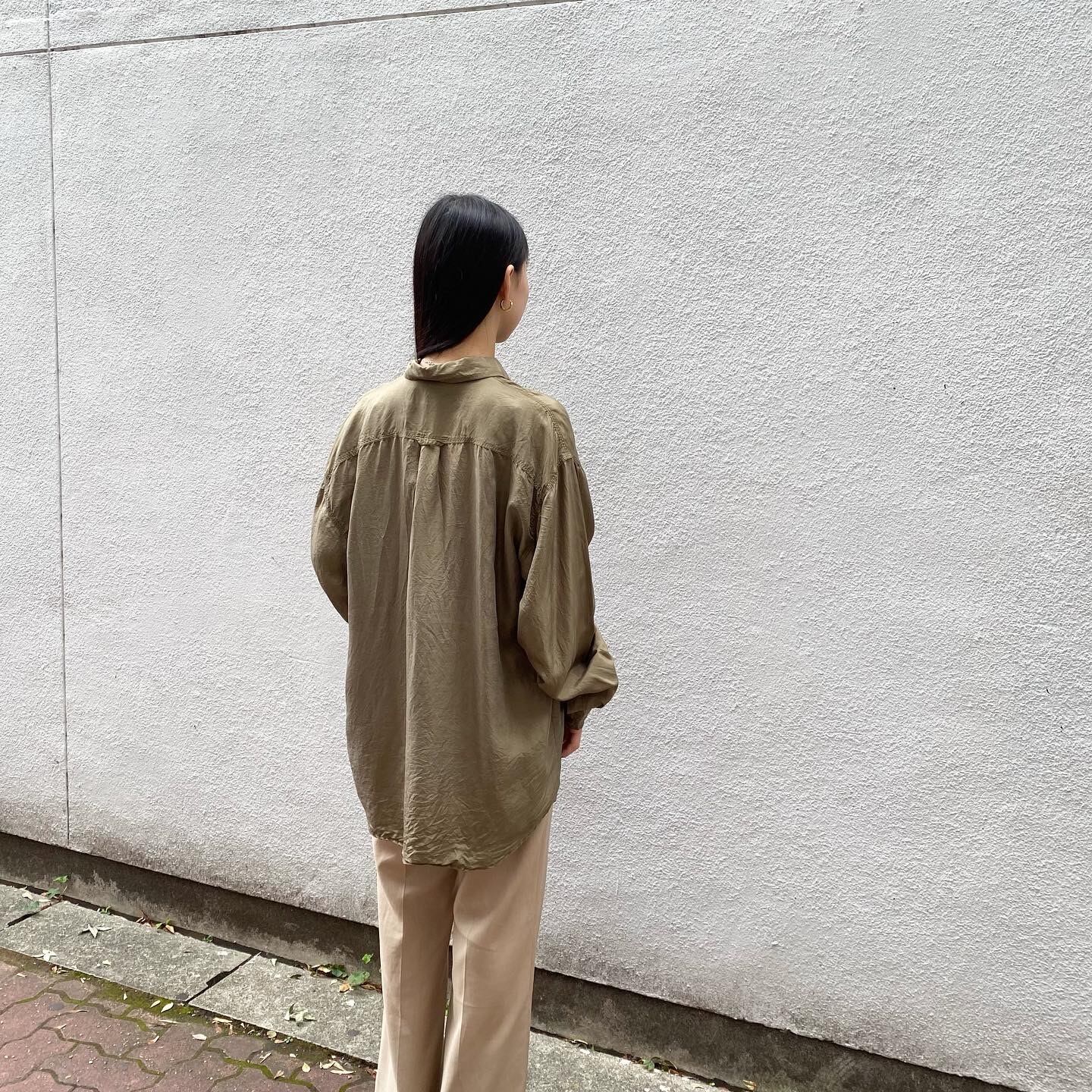 てろっとした質感で程よく光沢のあるシルクシャツです。ゆったりしたサイズ感と、袖のボリュームがポイントです。