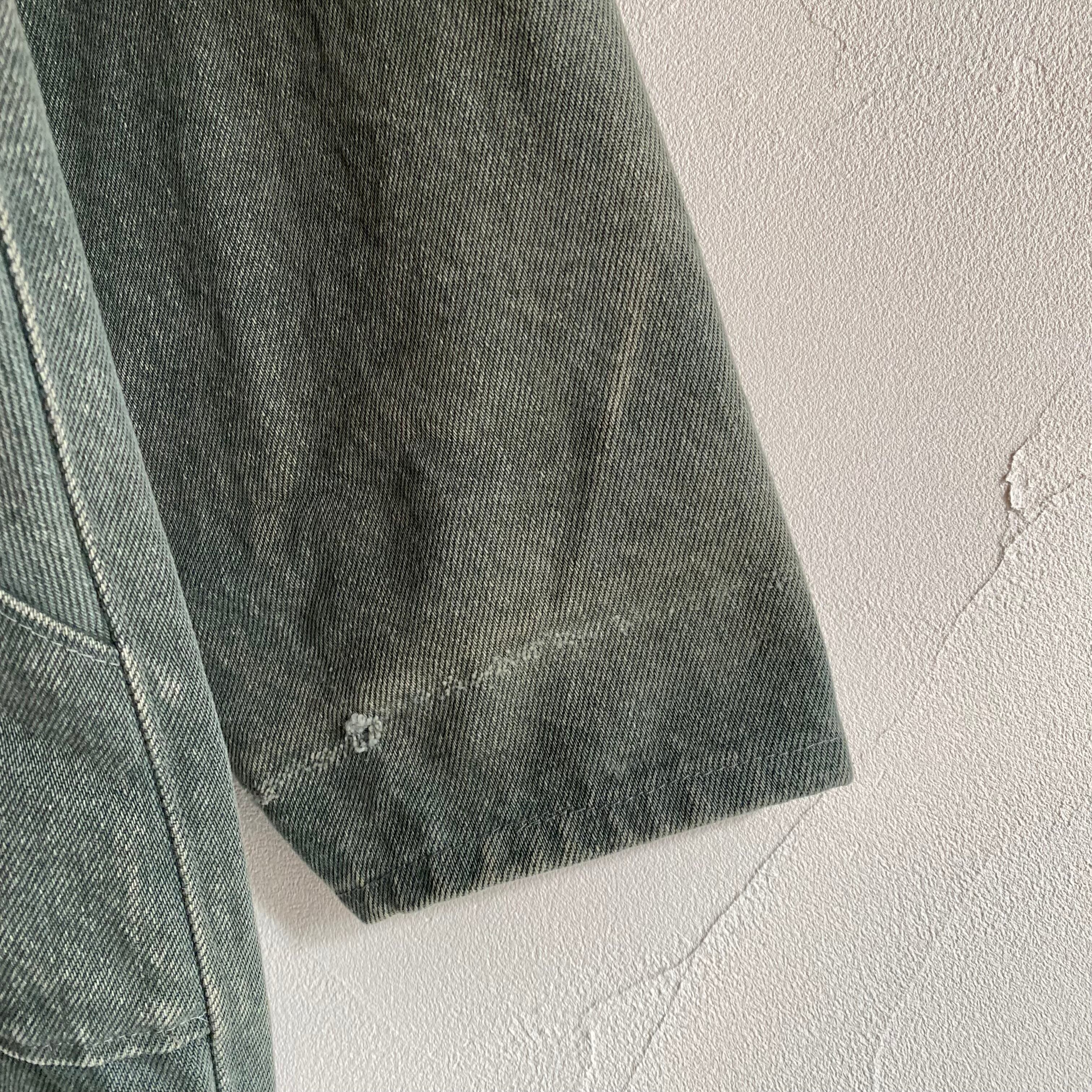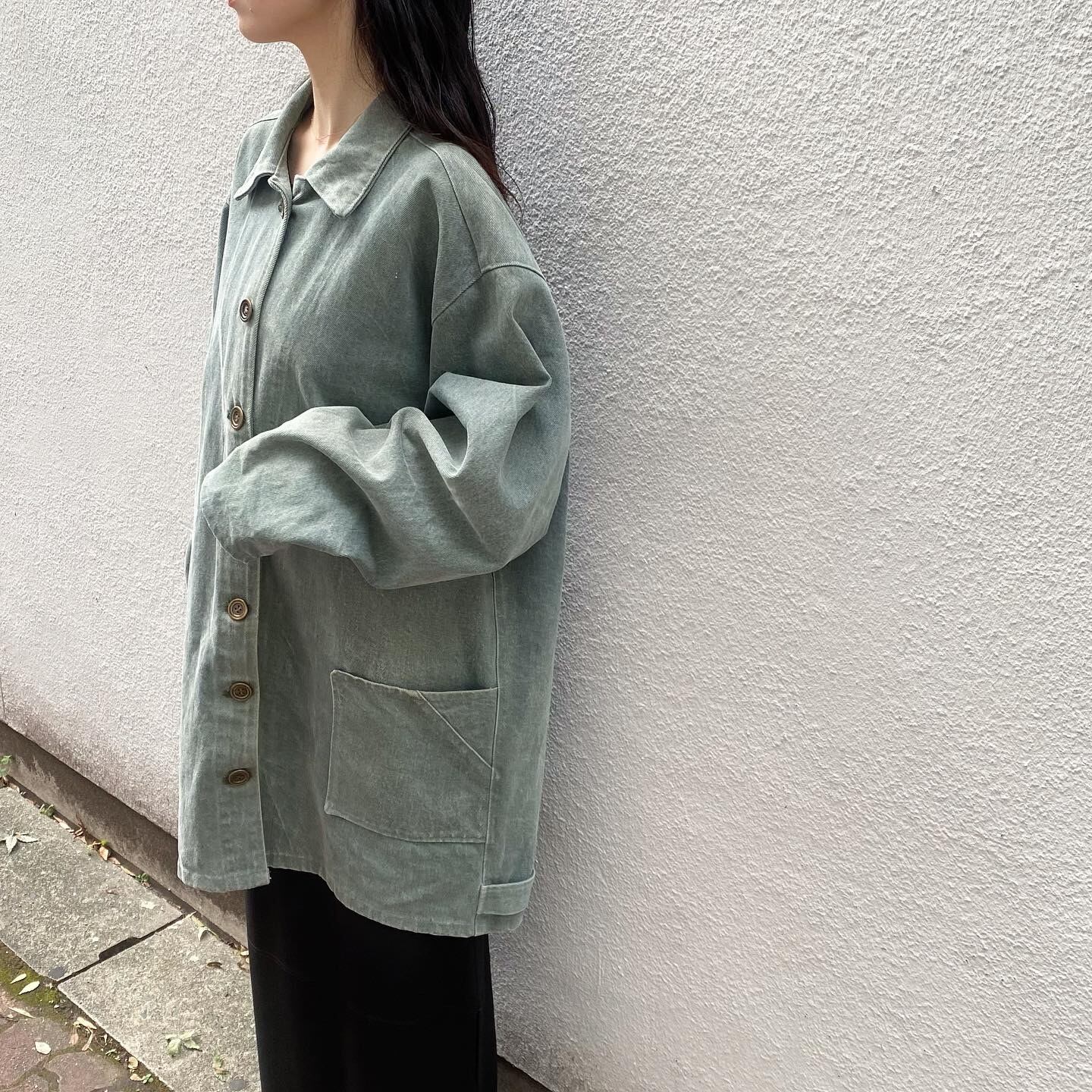 グリーンのデニムが珍しく、ビンテージらしいボタンが素敵なジャケットです。身幅やアームホールにゆとりがある為、スウェットやニット等ボリュームのあるトップスの上からも羽織ることができます。