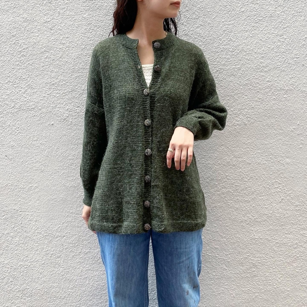 シルバーのヴィンテージ調のボタンと、濃いグリーンの配色がお洒落なモヘアカーディガンです。モヘア特有の毛足長めのふわふわ感が素敵です。