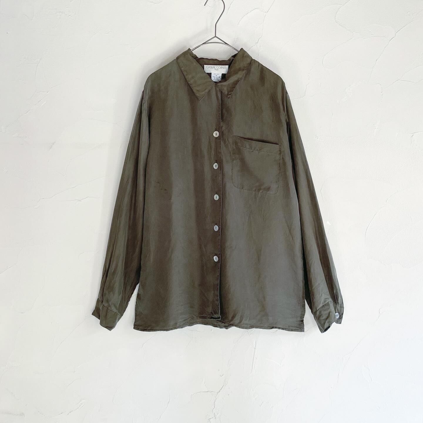 やや光沢感のあるカーキ色のシルクシャツです。キラキラと光るシェルボタンが魅力的で、サイズ感も程よくさらっとお召し頂けます。