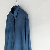 くすんだブルーが素敵なフェイクスエードシャツです。風を通しにくく、軽くて柔らかい生地感です。