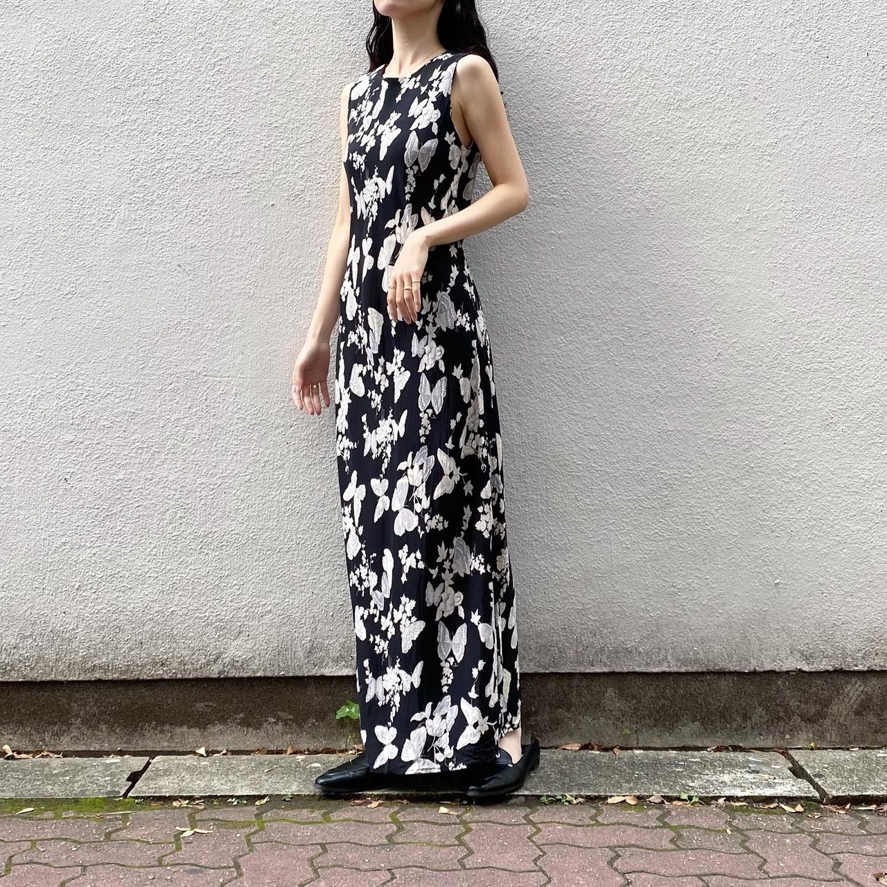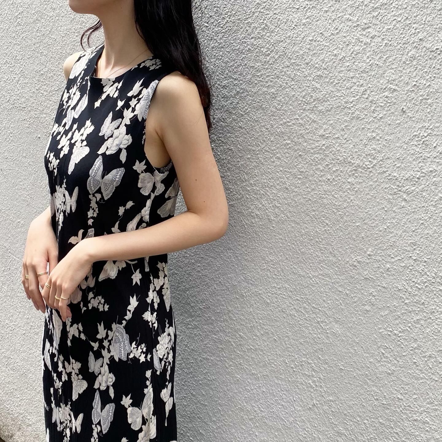 全体にプリントされたグレーの蝶が素敵なワンピースです。横に伸縮性のある生地感なので、身体のラインにぴったりと沿ってくれる1着です。