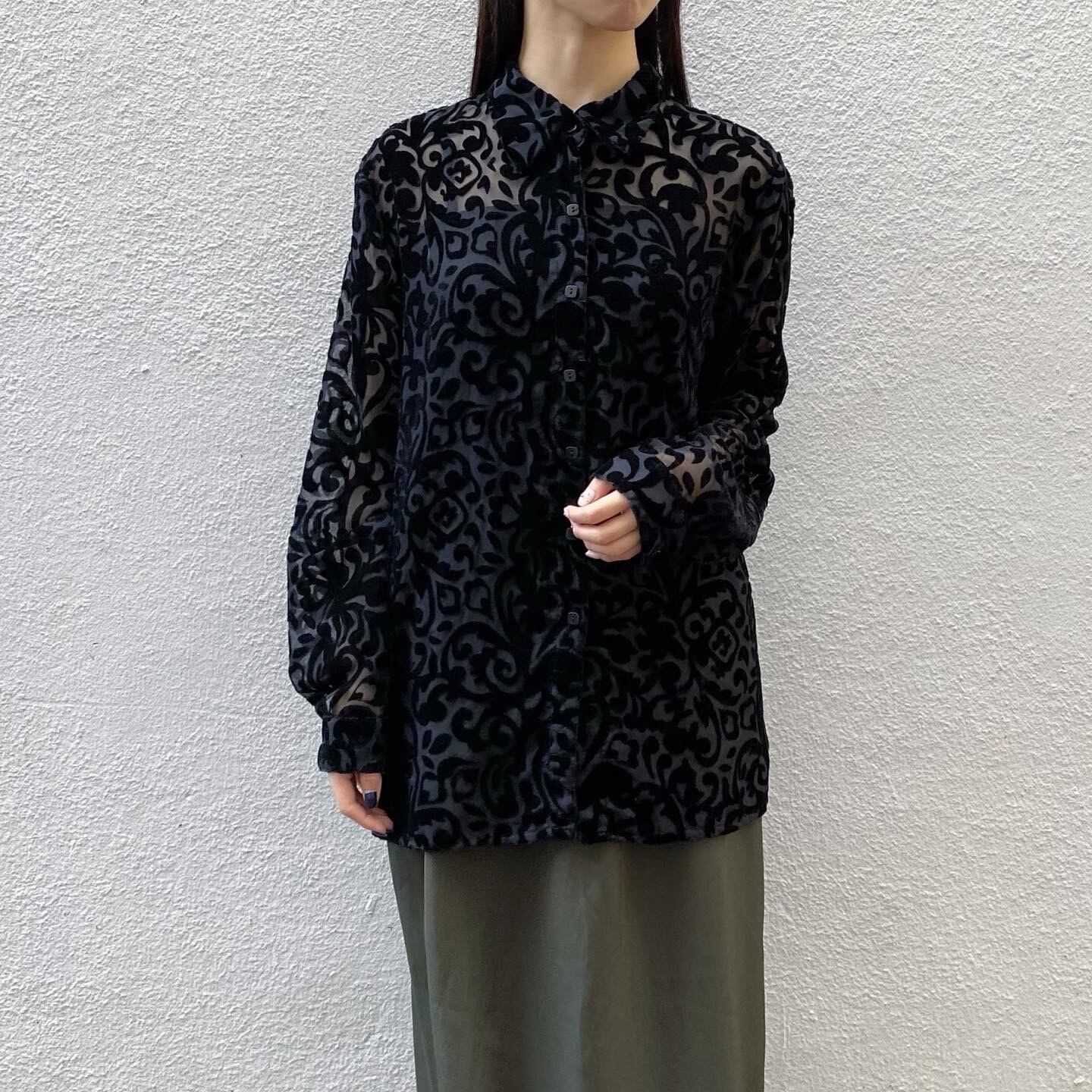 シアー生地に、ベロアのペイズリー柄が雰囲気のあるシャツです。程よく透け感があること重たくなりすぎず、主役になる一着です。