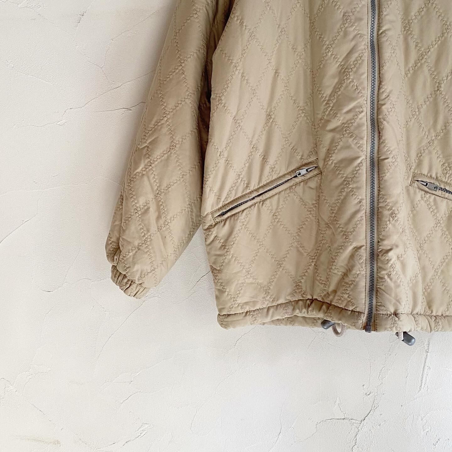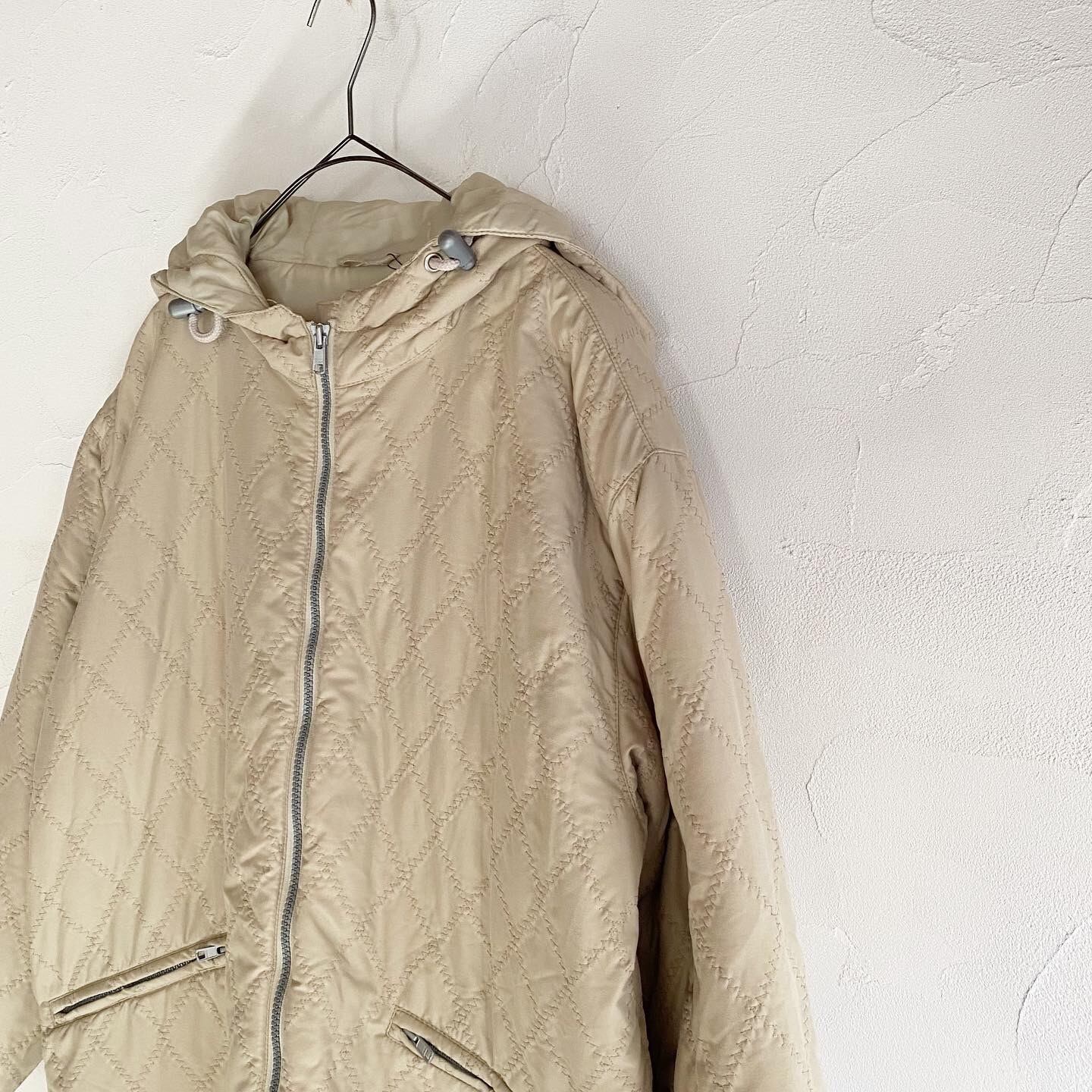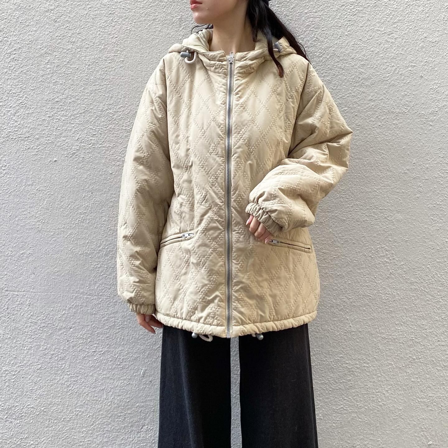 ナチュラルなベージュの色味が使いやすい、パディングジャケットです。裾とフードが絞れるようになっており、風を通しにくく暖かい一着です。