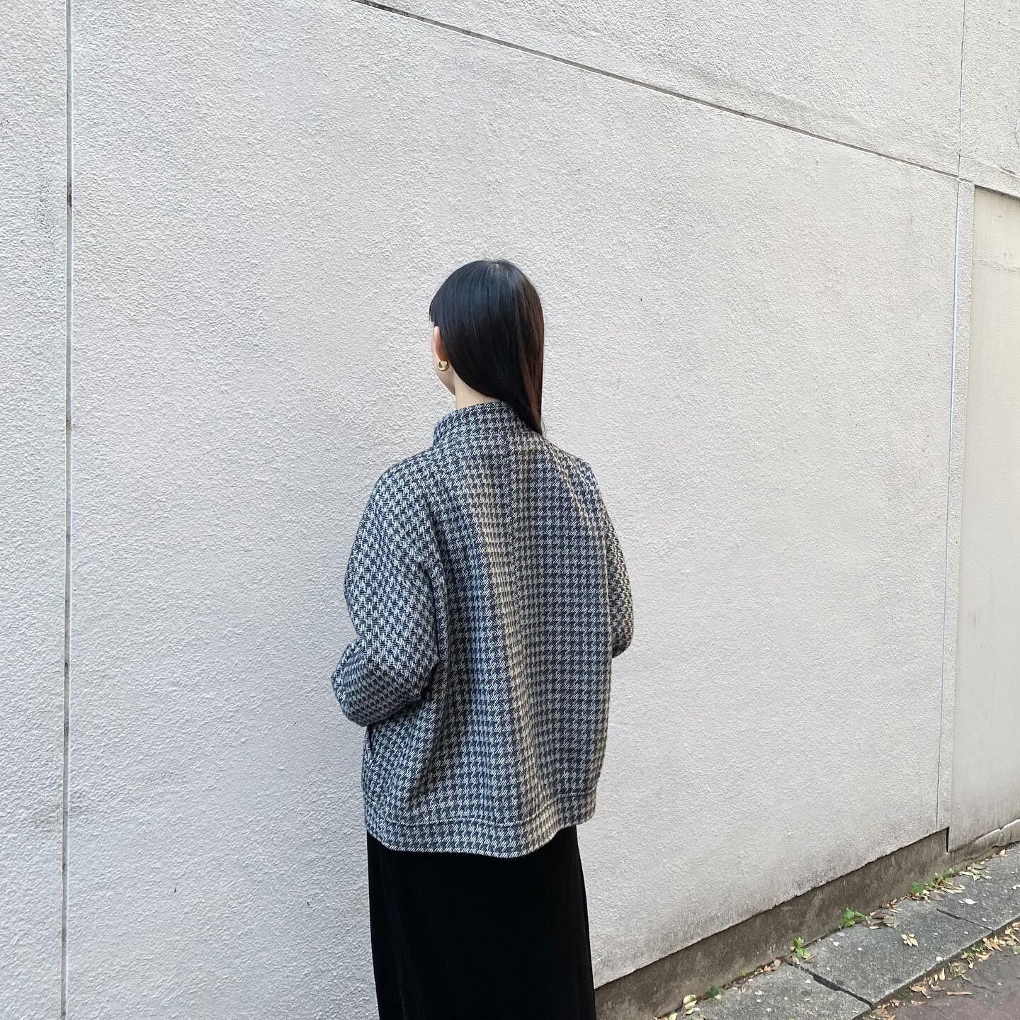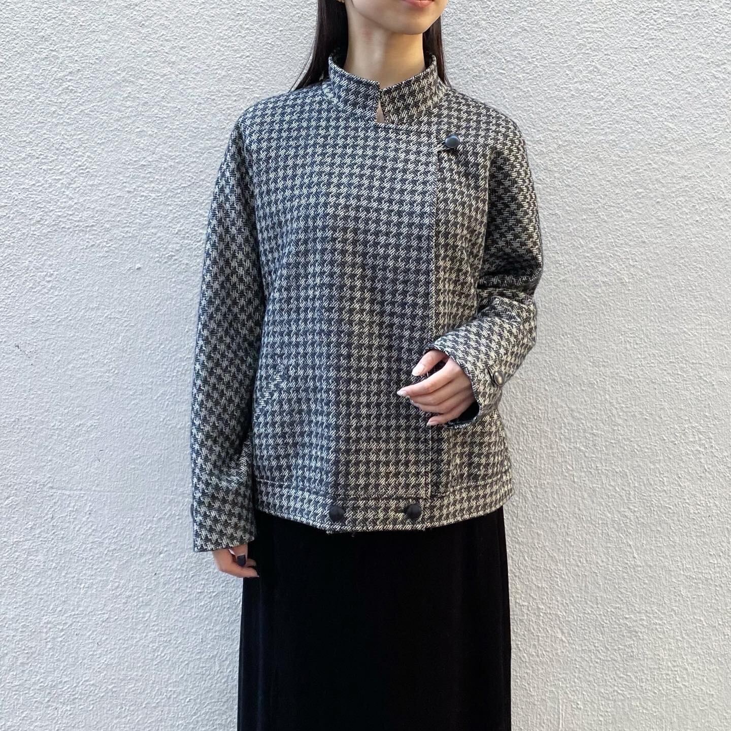 千鳥柄がお洒落で、スクエア型なシルエットが魅力的なジャケットです。首元や裾周りのデザインも素敵です。