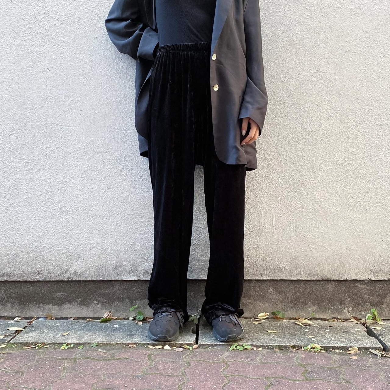 ストレートなシルエットで使い勝手の良い、ベロアパンツです。スパンデックス混で、伸縮性のあるさらっとした着心地です。