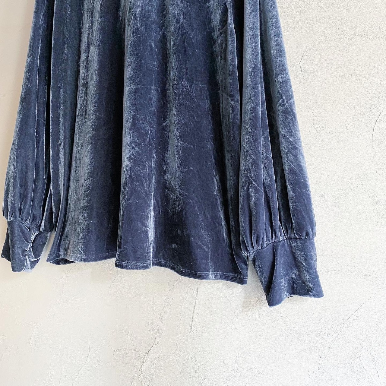 くすんだブルーの色味が素敵ななベロアトップスです。袖のボリューム感やゆるっとしたシルエットが魅力的な一着です。