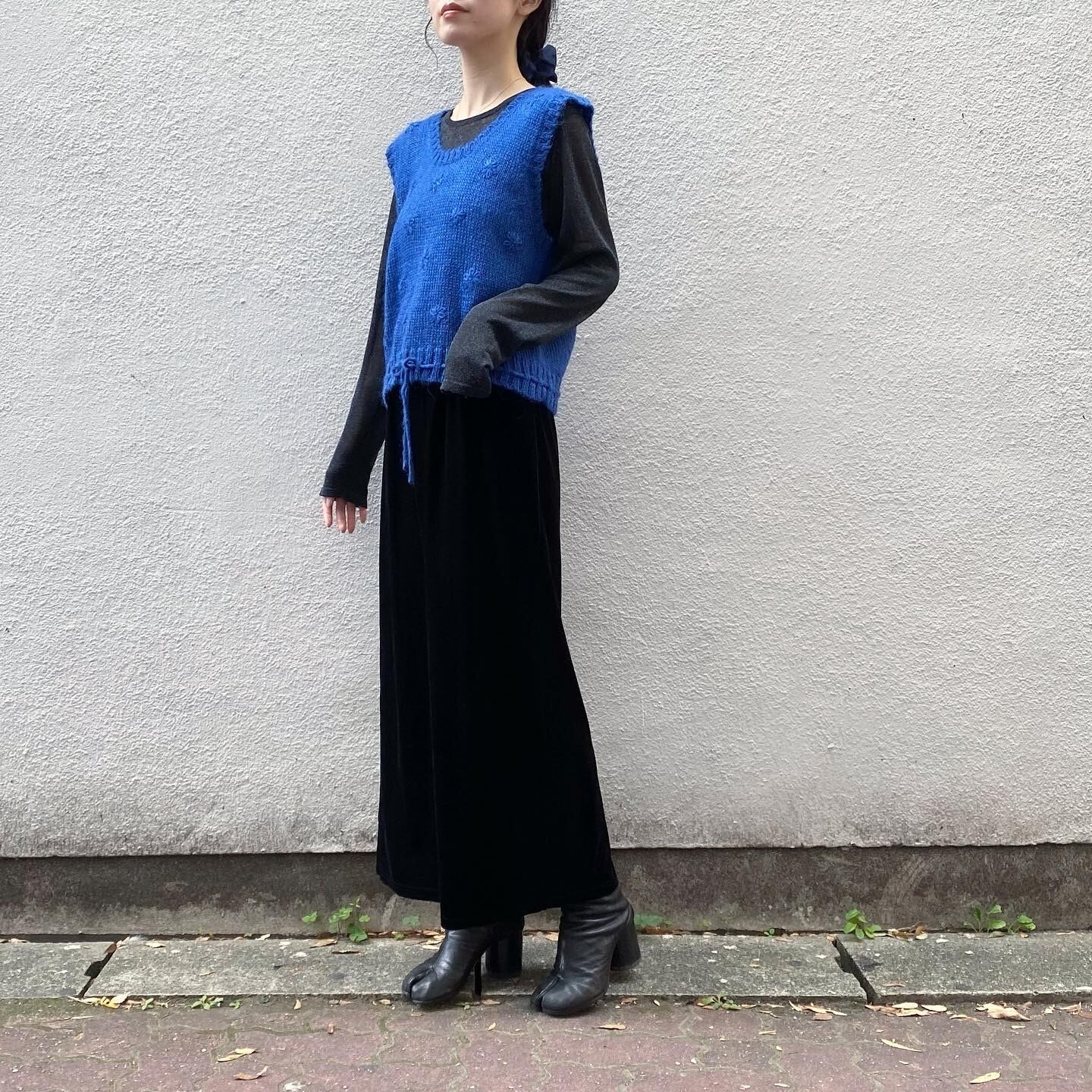 軽めで手触りの良いモヘア混のニットベストです。控えめな花柄の刺繍や裾元のリボンがポイントです。