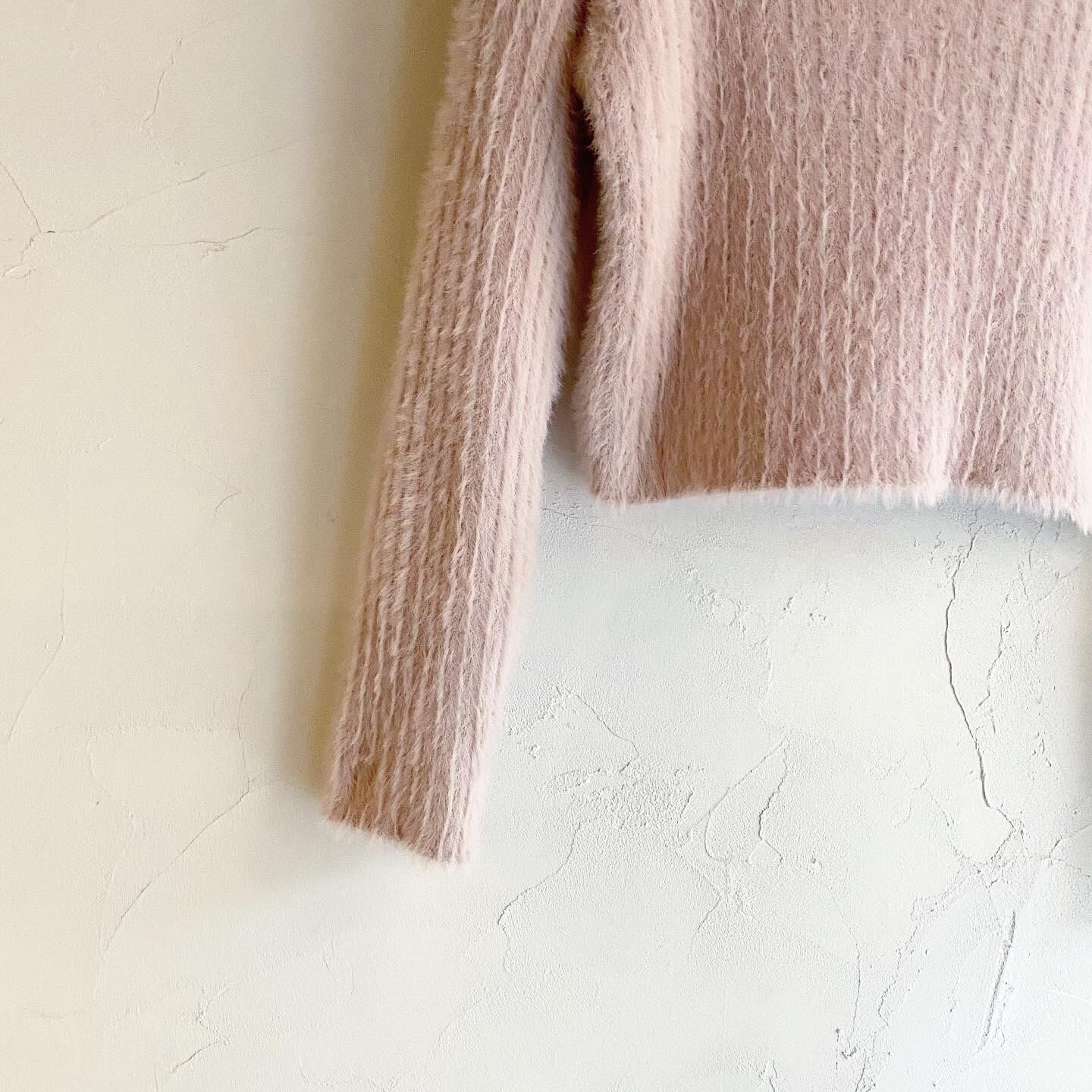 淡いピンクカラー、ふわふわな生地が素敵なリブニットです。デコルテを綺麗に魅せてくれる襟ぐりの空き具合で、華奢見えする一着です。