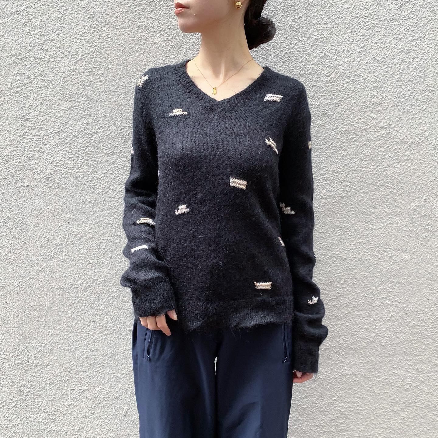 全体に施された刺繍が素敵なモヘアニットです。コンパクトめなサイズ感に長めの袖丈のバランスが可愛いです。
