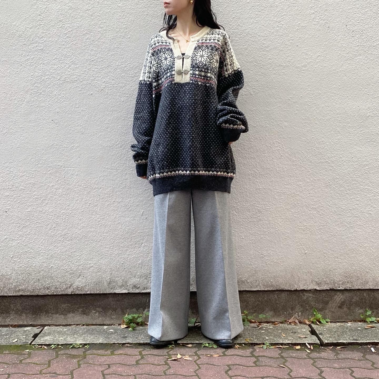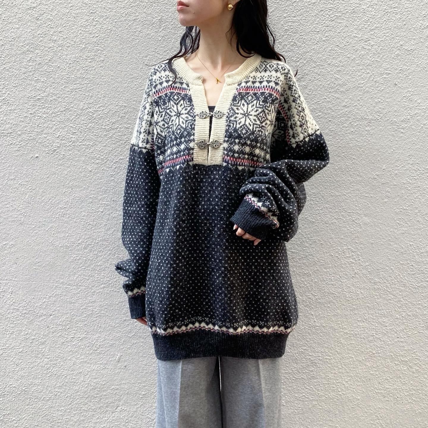 ウールですがかなり軽めで着心地の良いノルディックニットです。シルバーの金具や雪の結晶のデザインが冬らしいアイテムです。