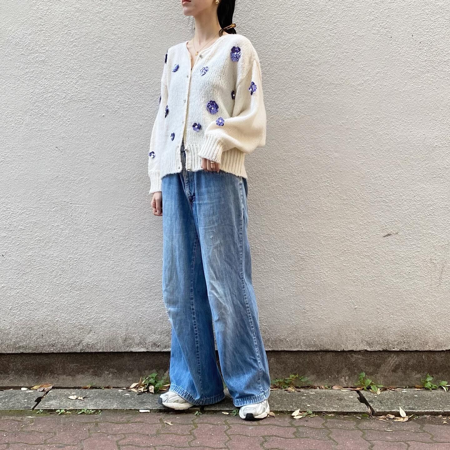 スパンコールのお花や煌めくボタンが他には無い、ニットカーディガンです。