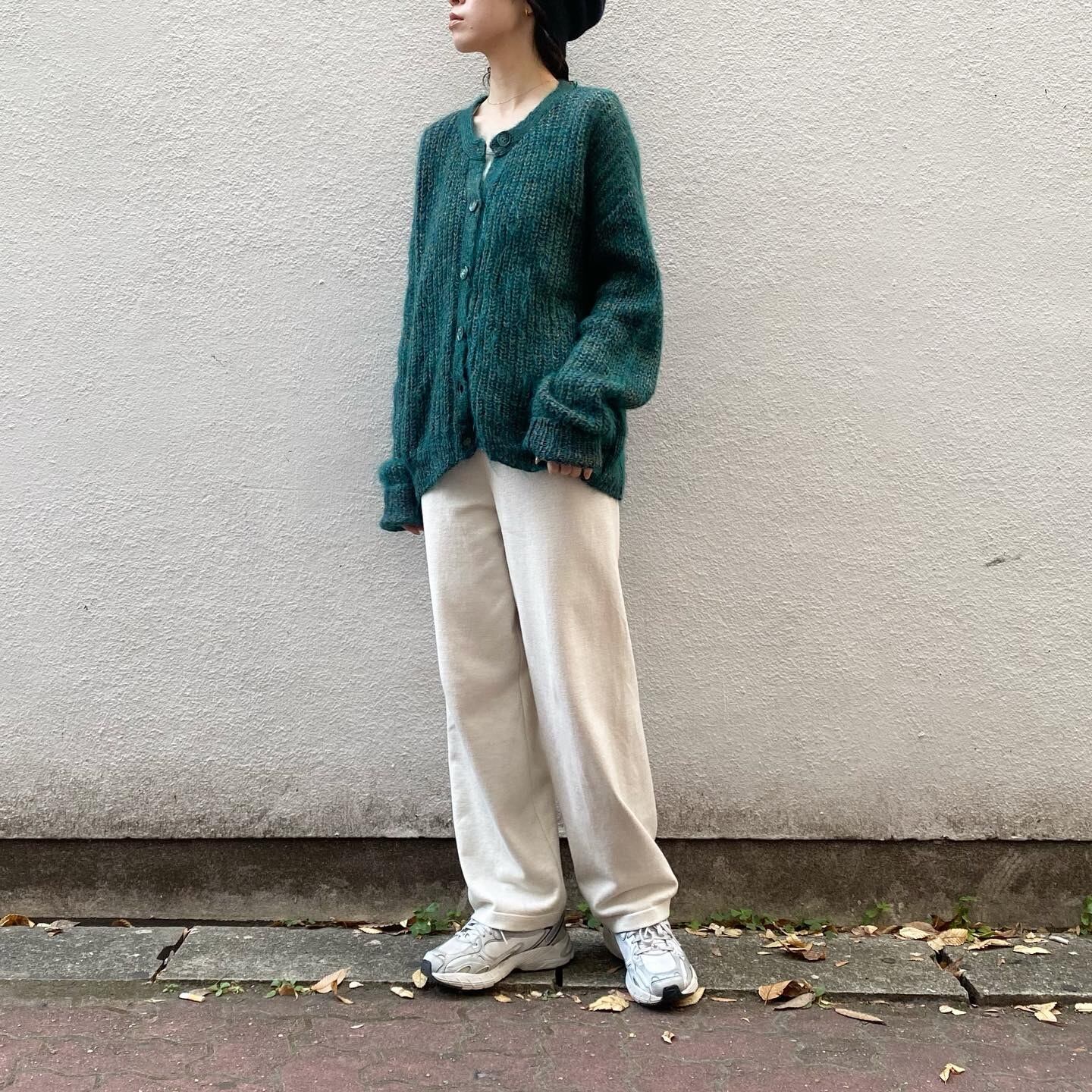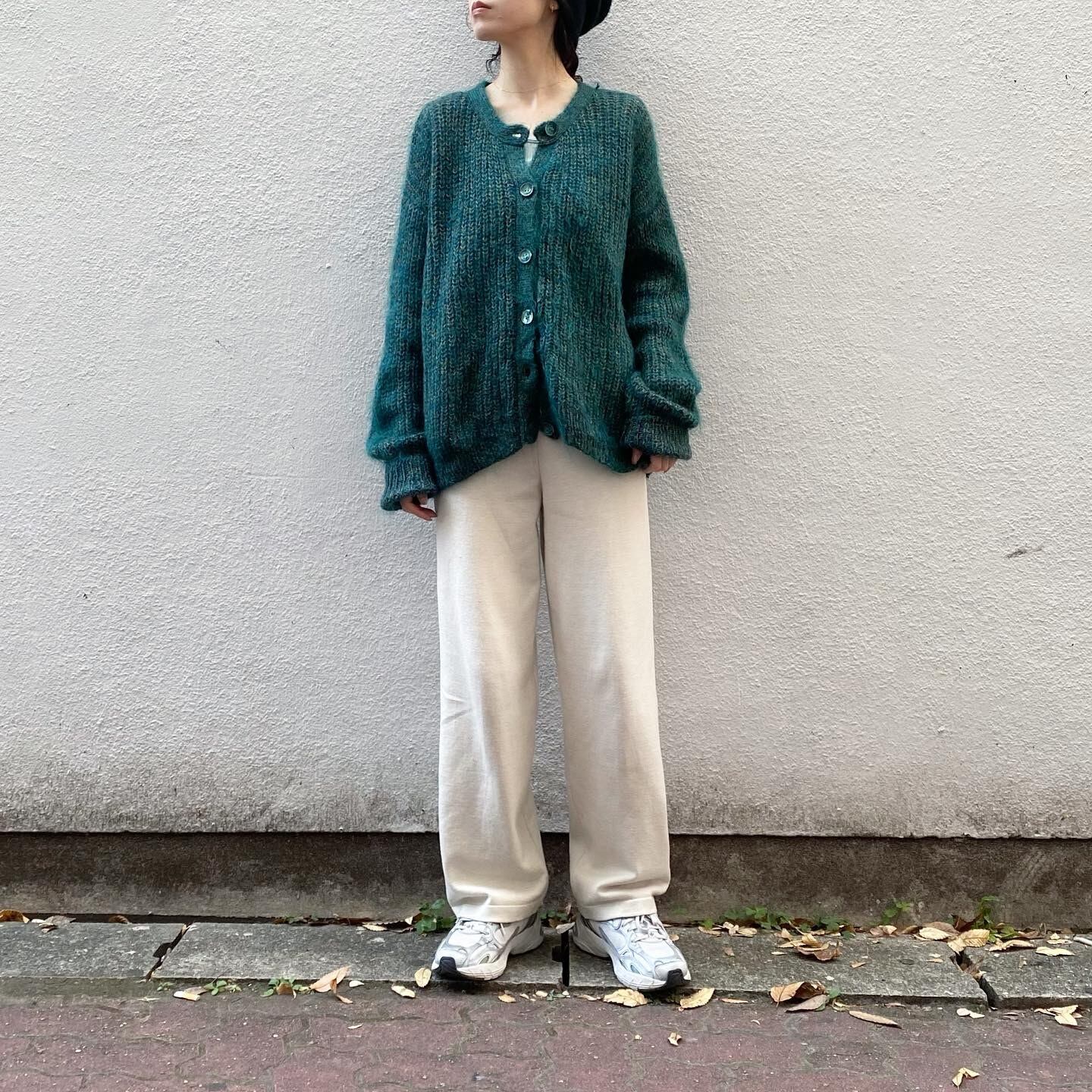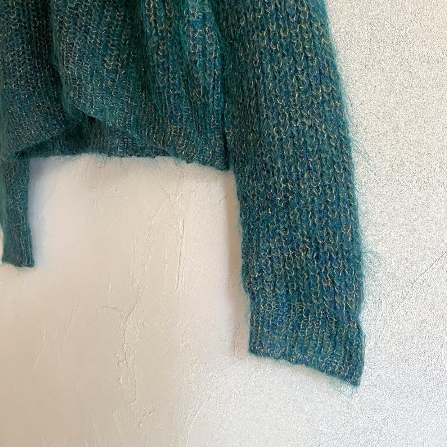ブルーやイエローの糸が織り込まれている素敵なカラーリングのモヘアカーディガンです。チクチク感もあまり無く、ボリュームのある袖元がとても愛らしい1着です。
