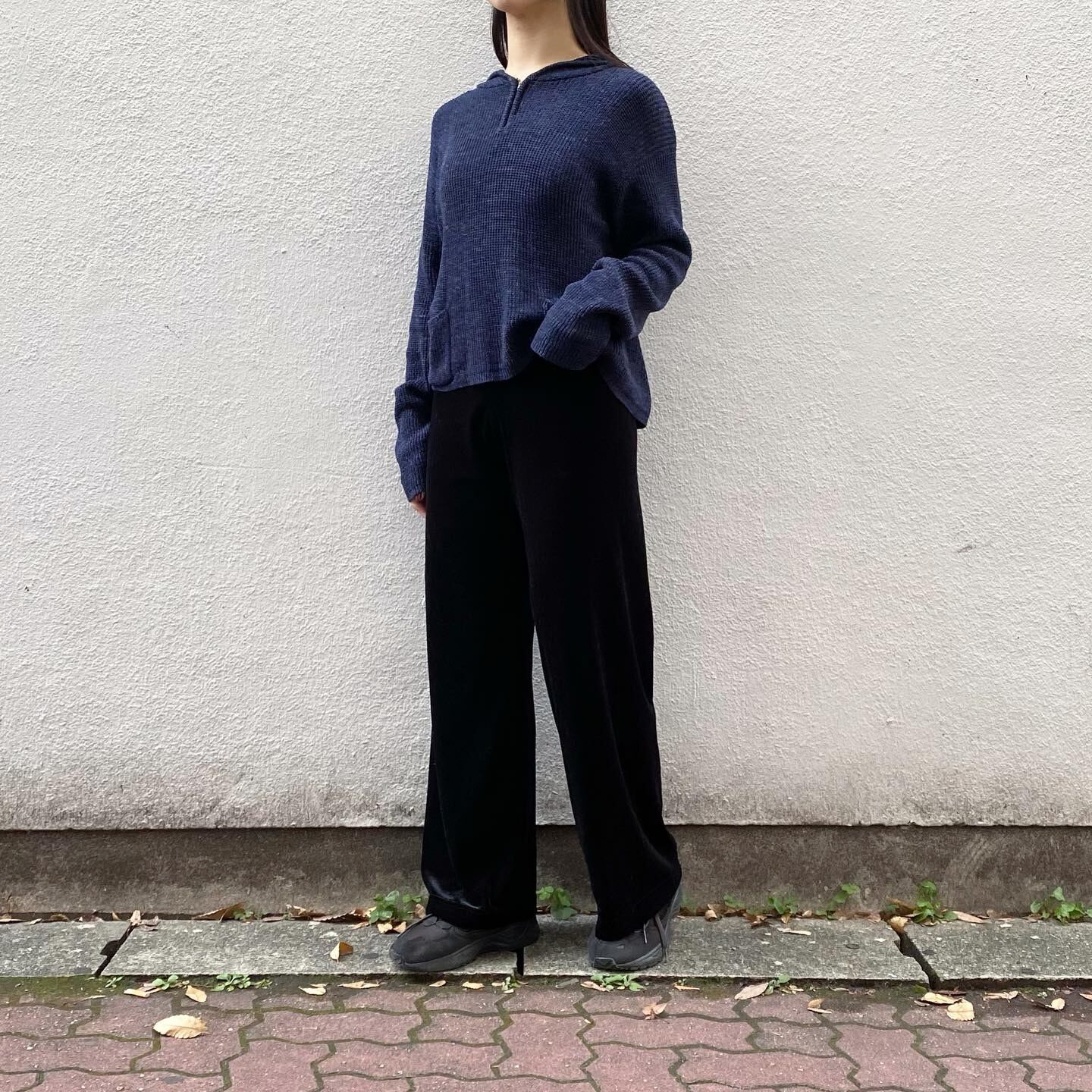 スパンデックス混でさらっとした履き心地のベロアパンツです。光沢が程よくマット寄りなベロア素材なので、デイリー使いしやすい一着です。