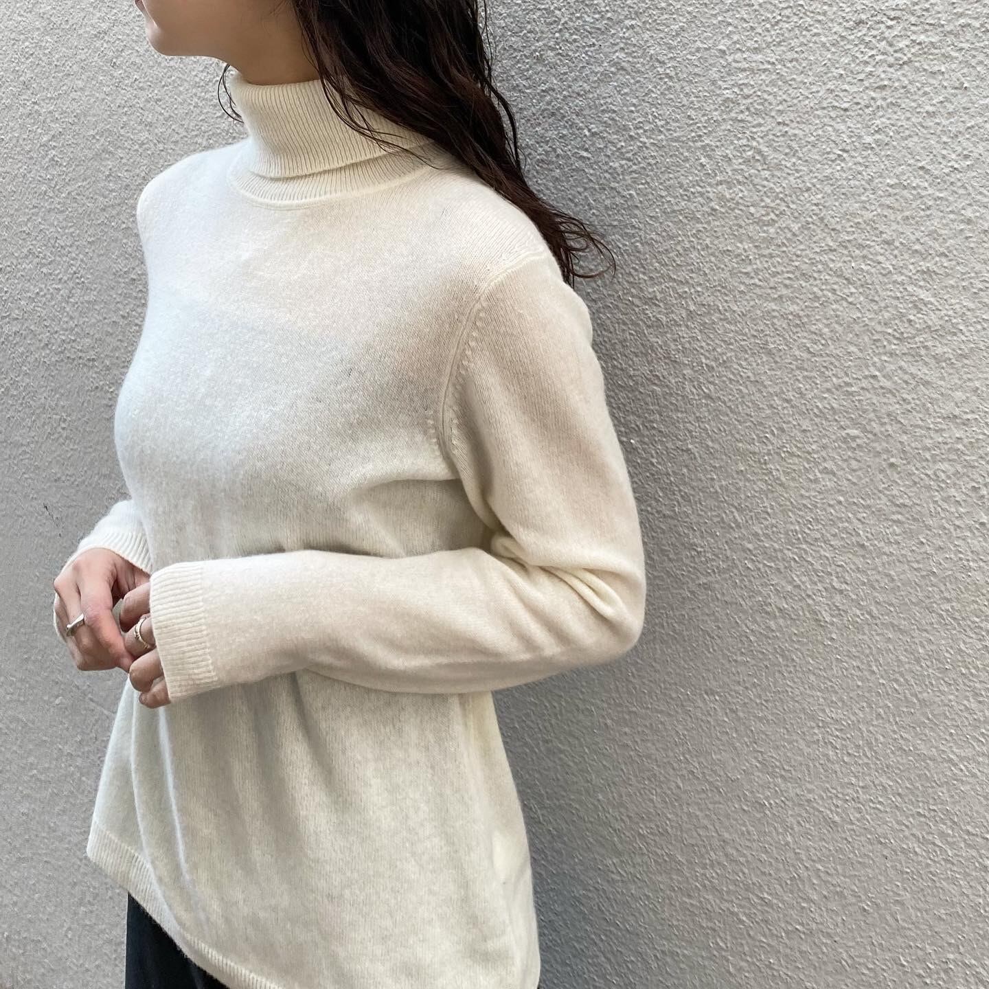 ふわふわな100% カシミヤのタートルネックニットです。着丈は長めなのでベストなどとレイヤードするのもオススメです。