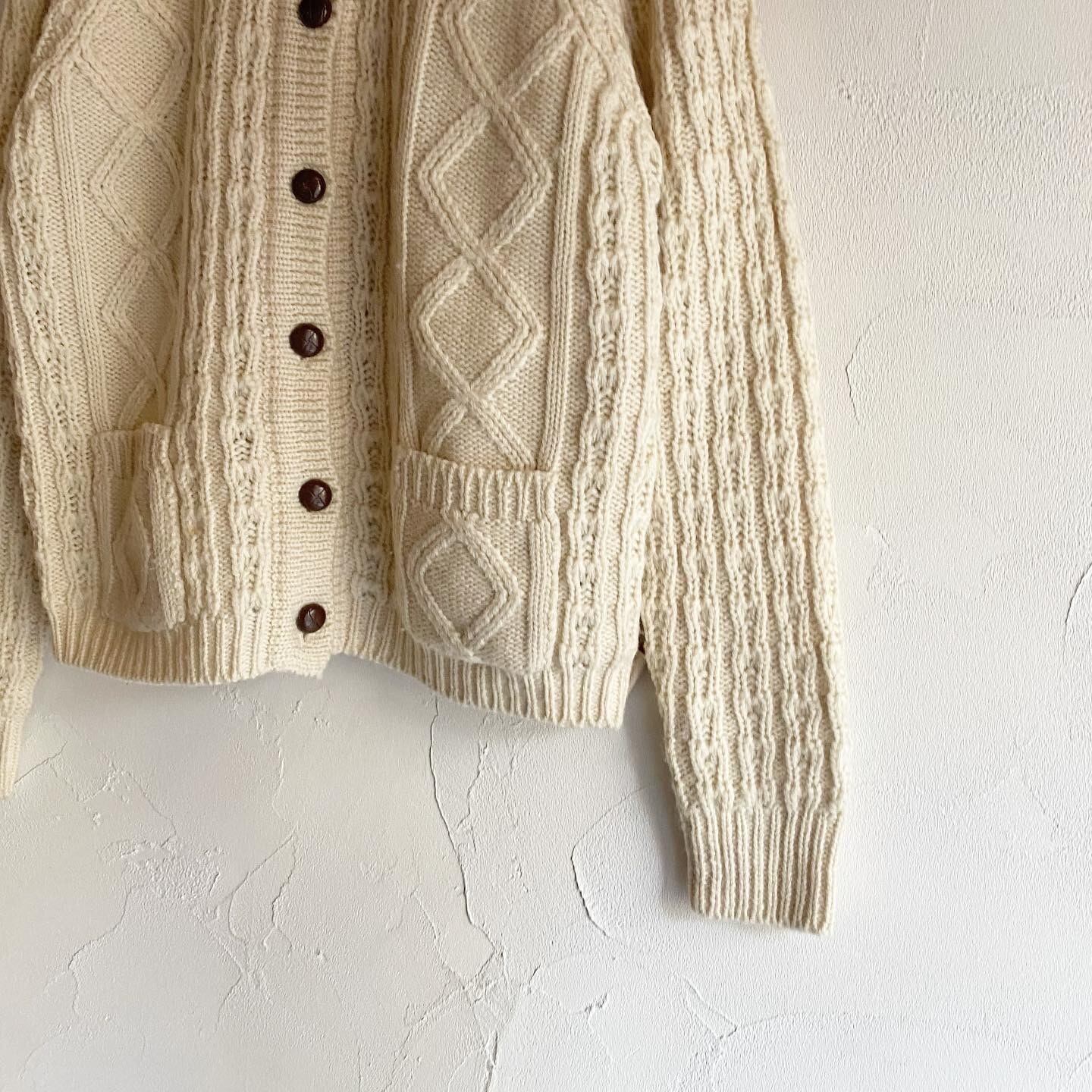 ぽこぽことした立体的な編み地が愛らしいアランニットカーディガンです。軽くて柔らかく、ウール100%ですがちくちくもほとんど気にならない一着です。