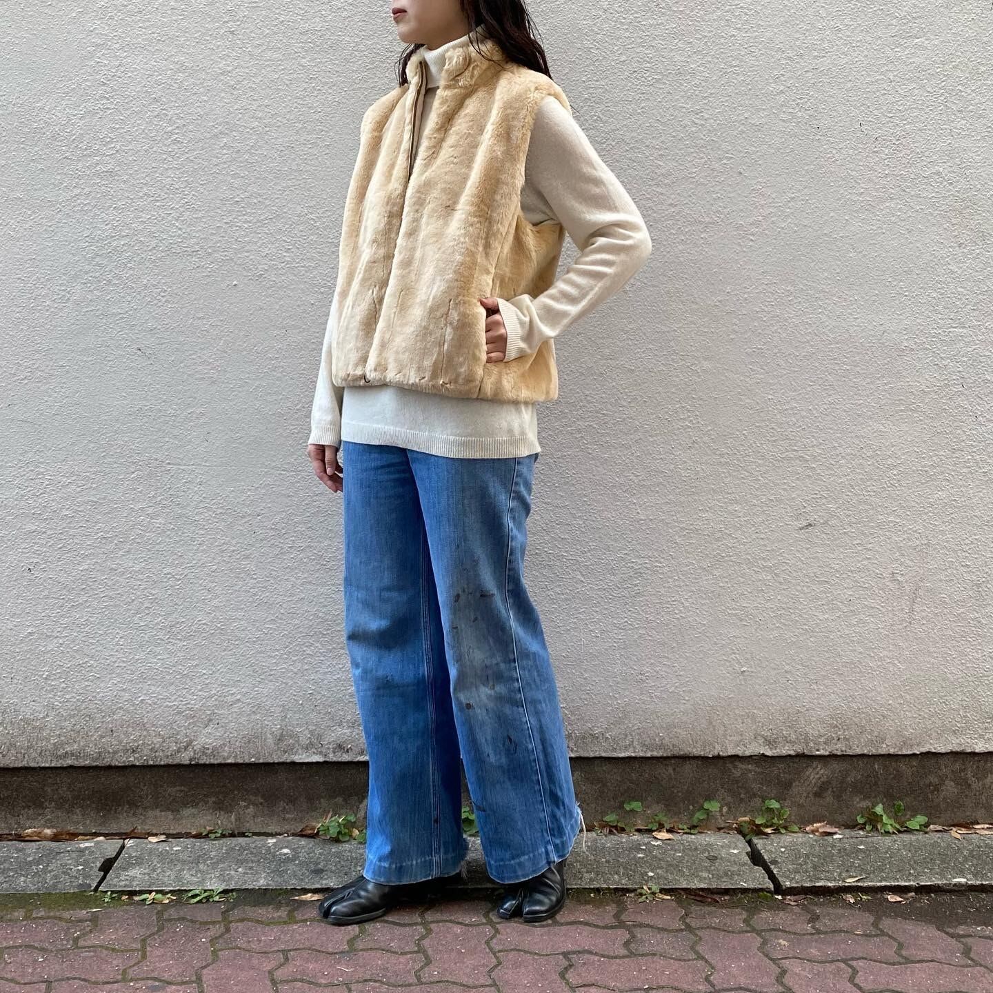 ほわほわな触り心地で明るめの色味が珍しいファーベストです。首元までジップが閉まるのでとても温かくお召し頂けます。