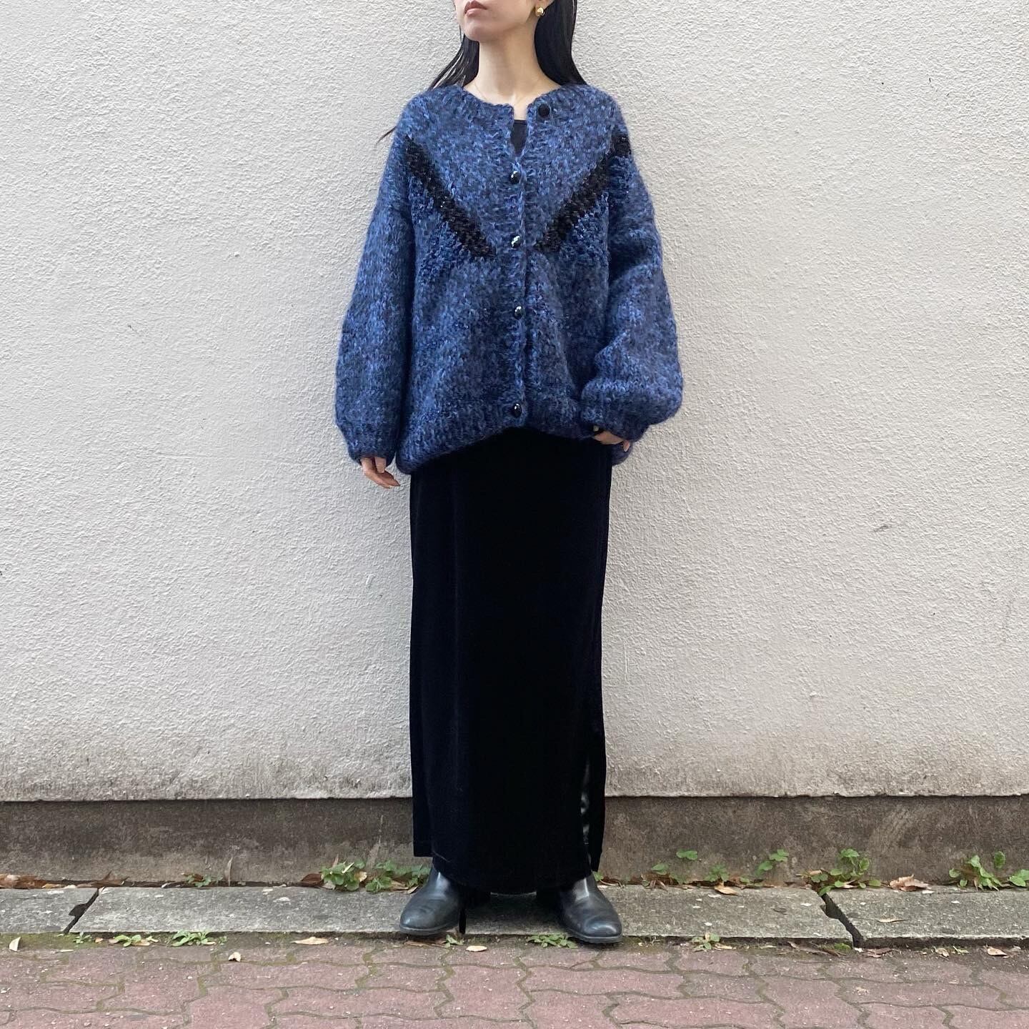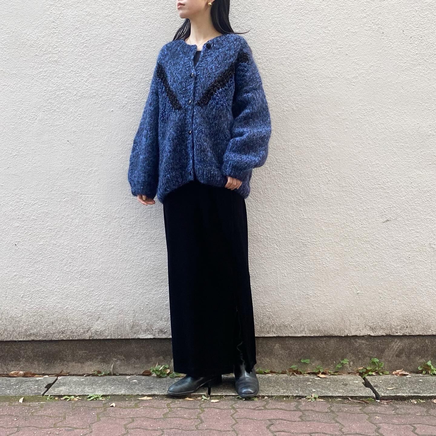 生地感の違ったニットにラメ糸が織り交ざっているのが素敵な、モヘアニットカーディガンです。