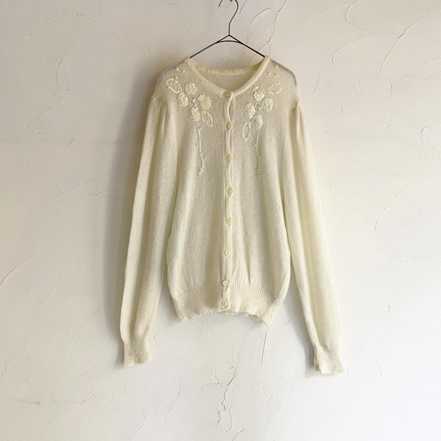 スパンコールやパールなどほ装飾があしらわれた繊細なニットカーディガンです。軽めなニットなので春先までも着回しが効きそうなアイテムです。