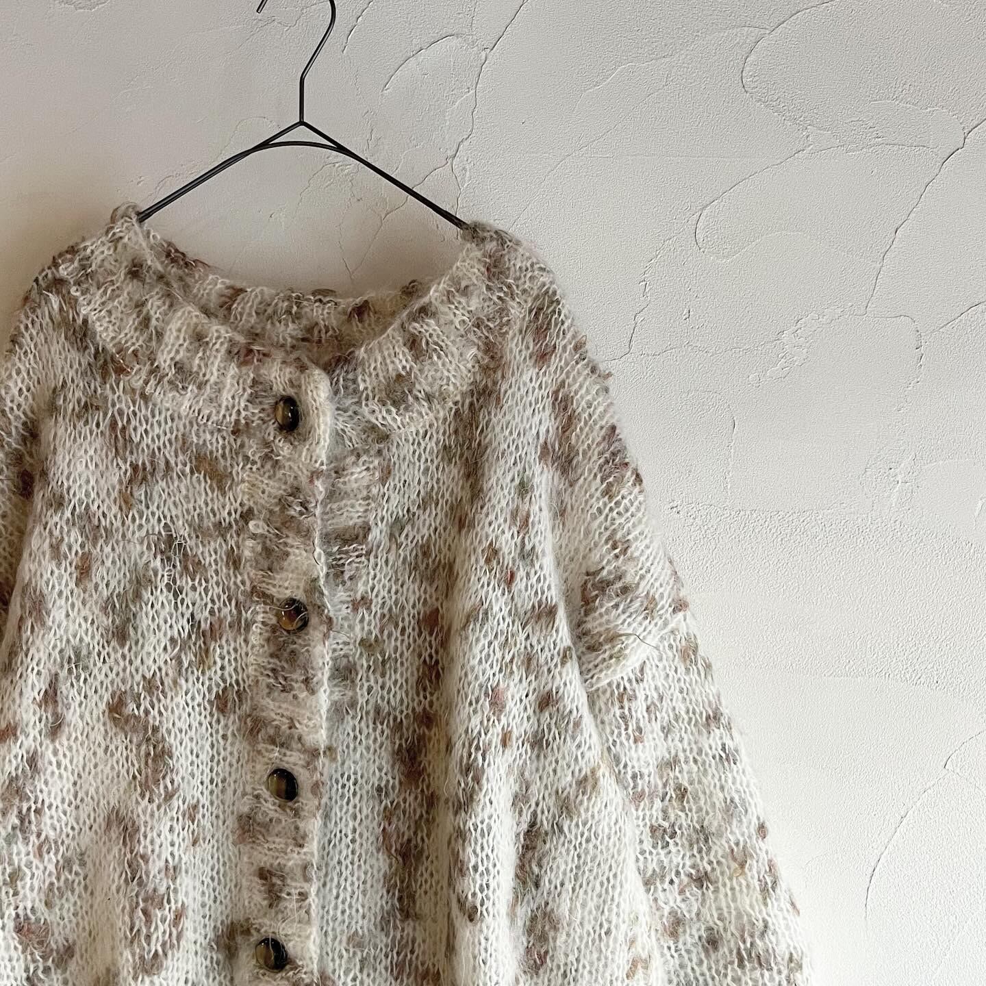 アイボリーベースにカーキやブラウンの糸が織り込まれたモヘアニットです。古着特有の他にはないデザインや、たっぷりとした袖のボリュームが魅力的な一着です。