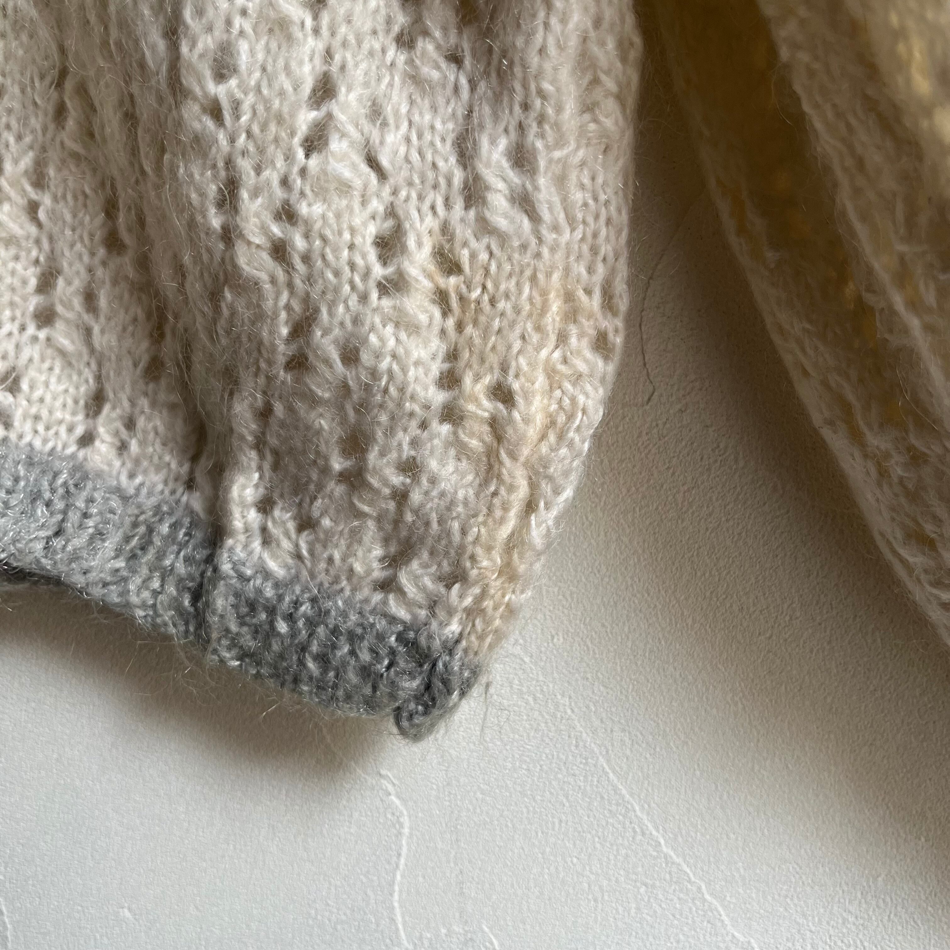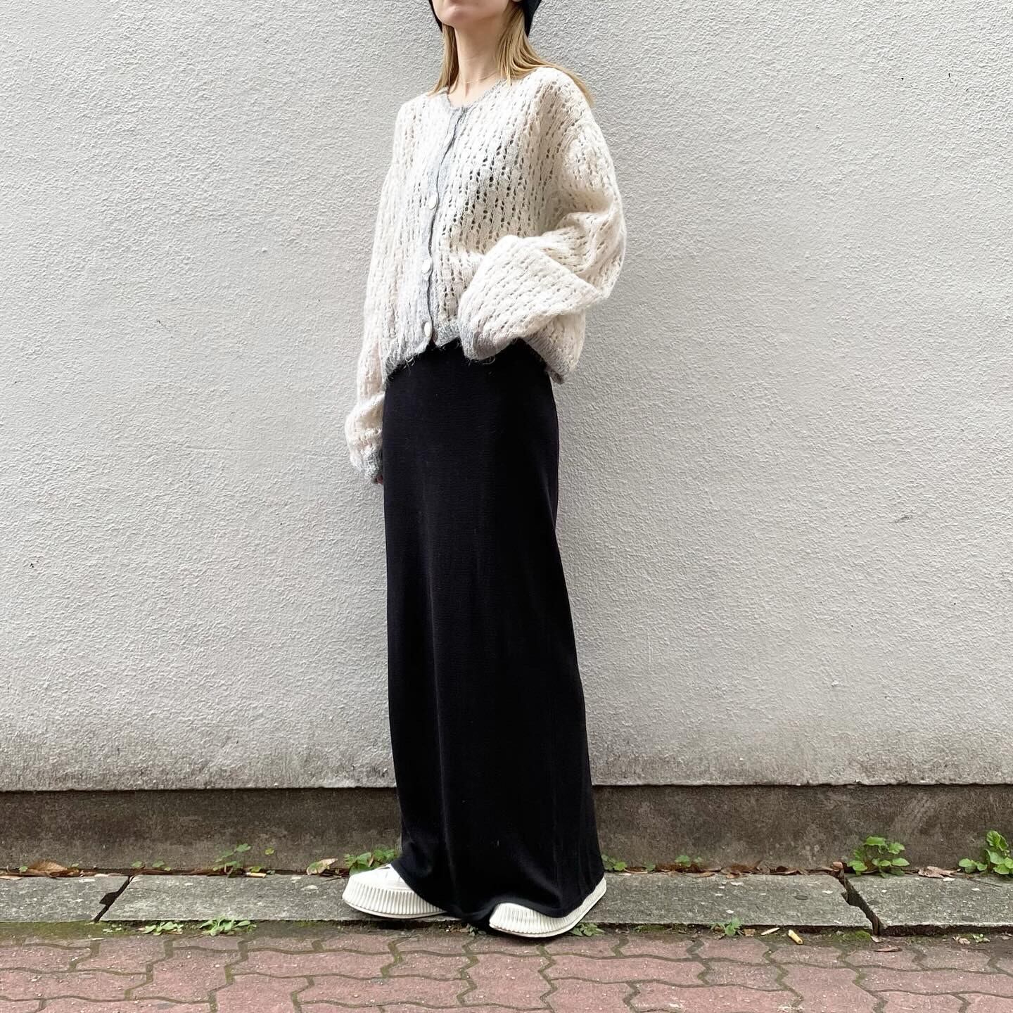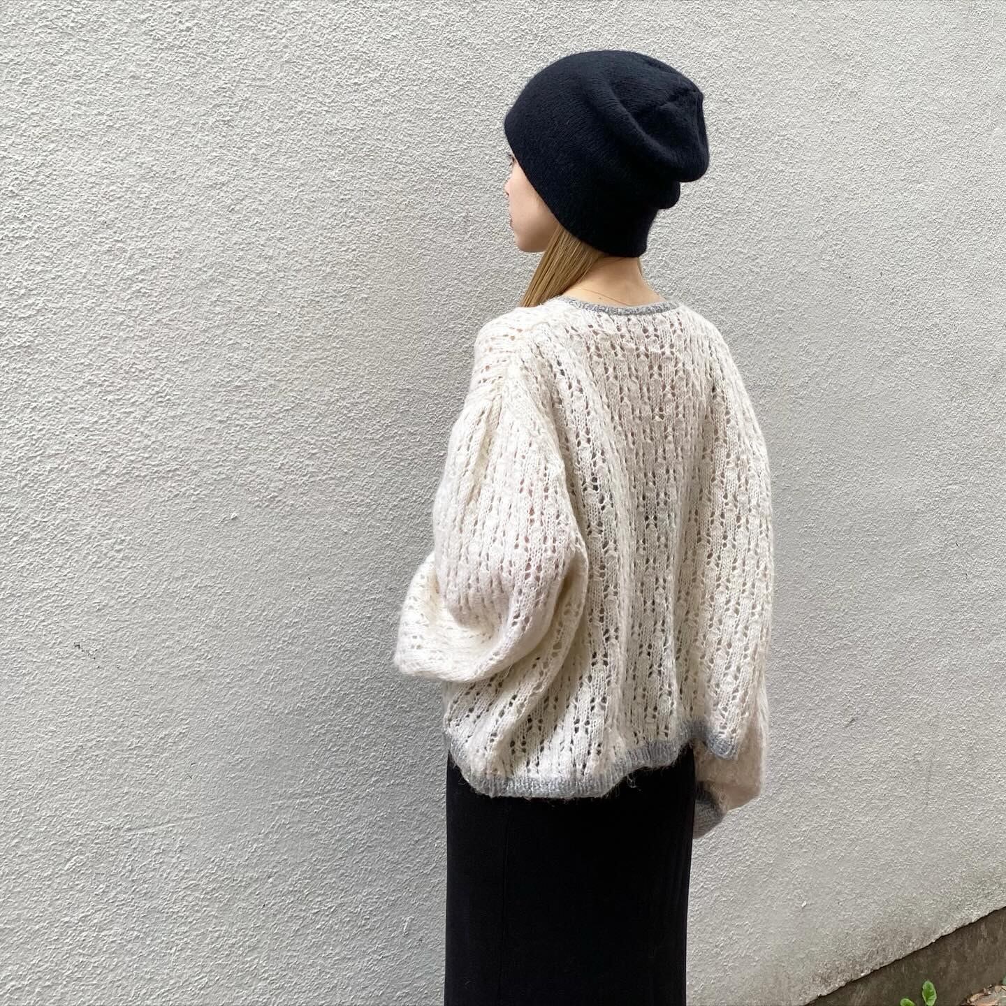 着丈に対し身幅やアームが広めで、グレーのニット生地にラメ糸が織り交ぜられています。