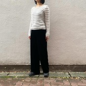 ラメ生地にふわふわとしたニットのボーダーが素敵なトップスです。首元の空き具合が女性らしく、美しい一着です。