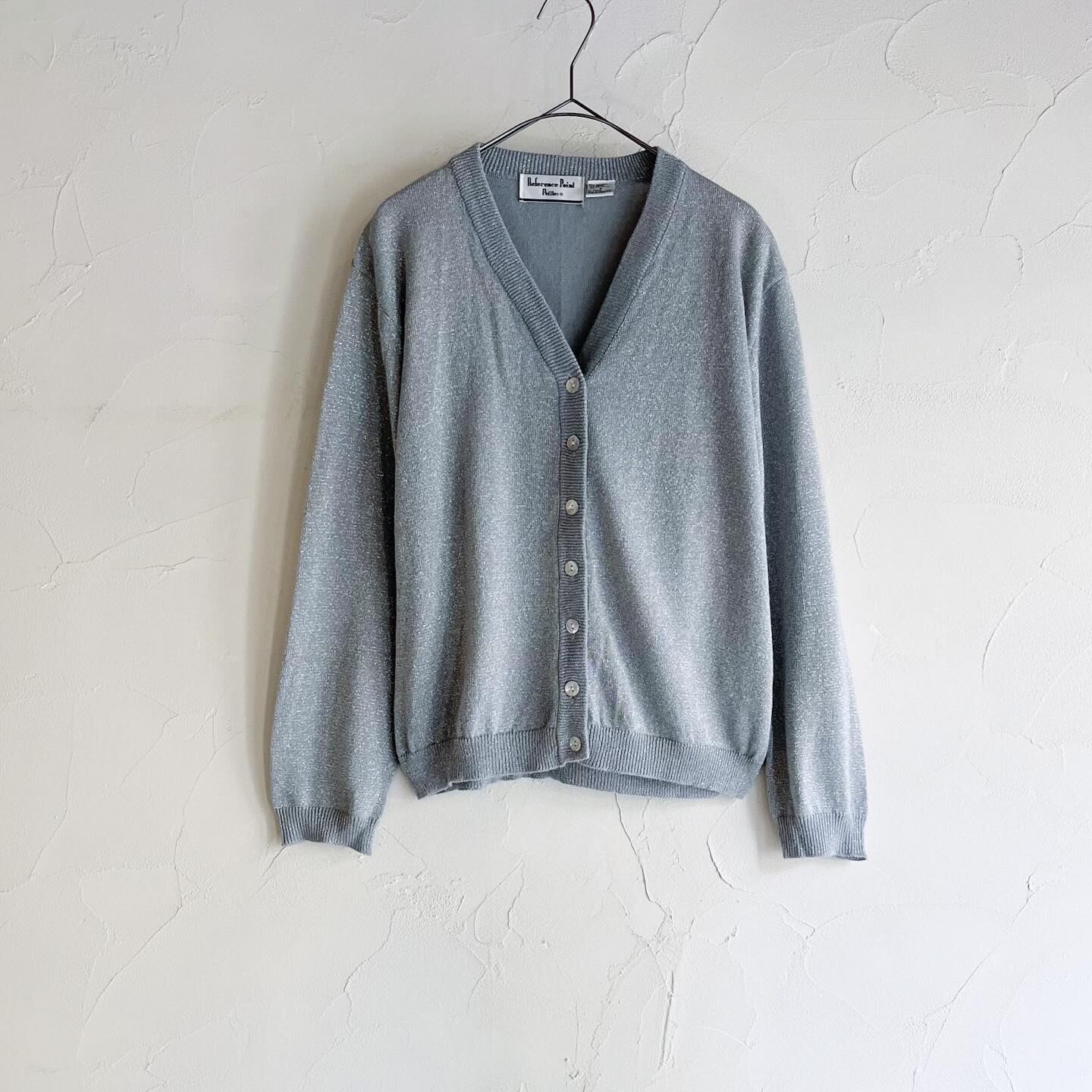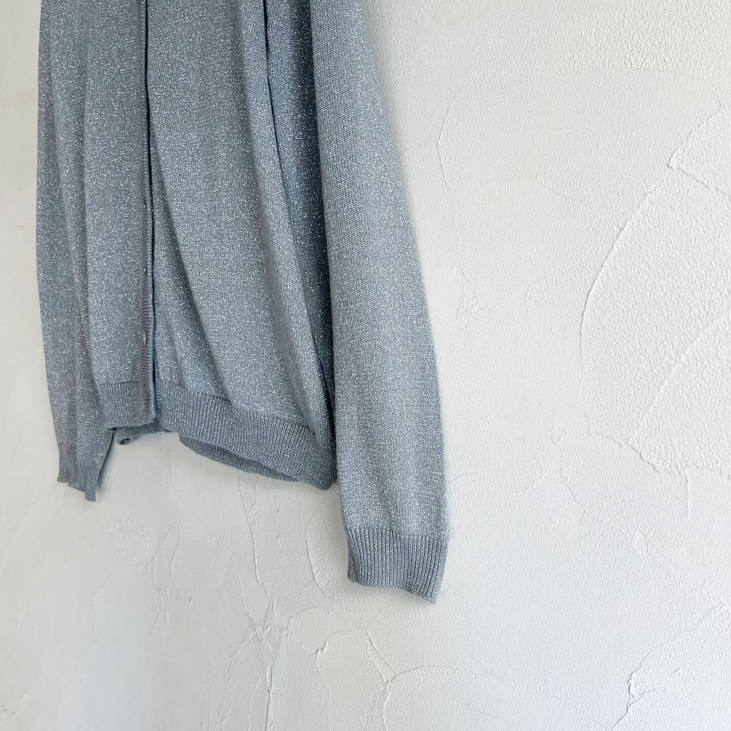 グレーのニット生地にシルバーのラメ糸が施されたカーディガンです。さらっと軽い生地感で、レイヤード次第で長い季節お召し頂けます。