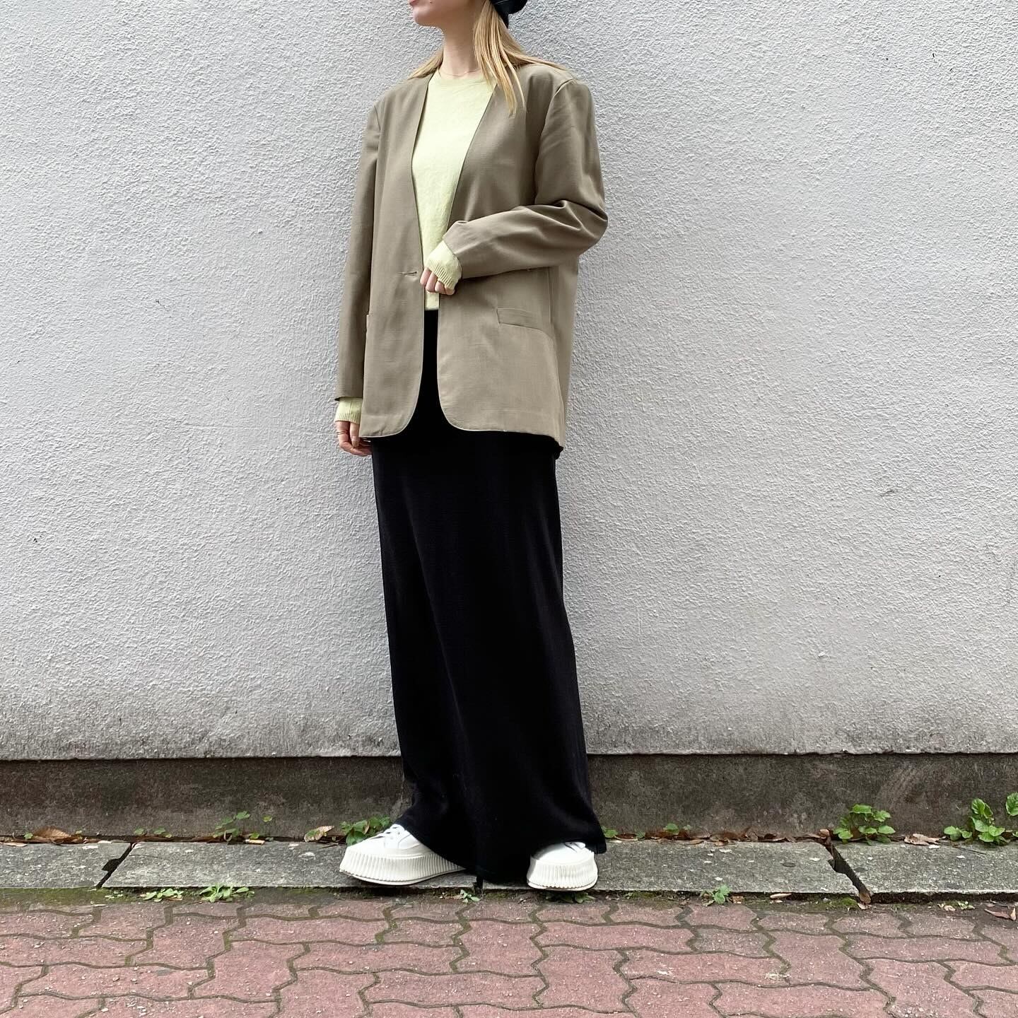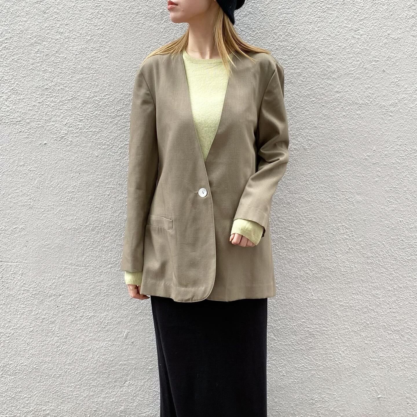 くすんだカーキが肌馴染みの良いノーカラージャケットです。艶々のシェルボタンもポイントです。