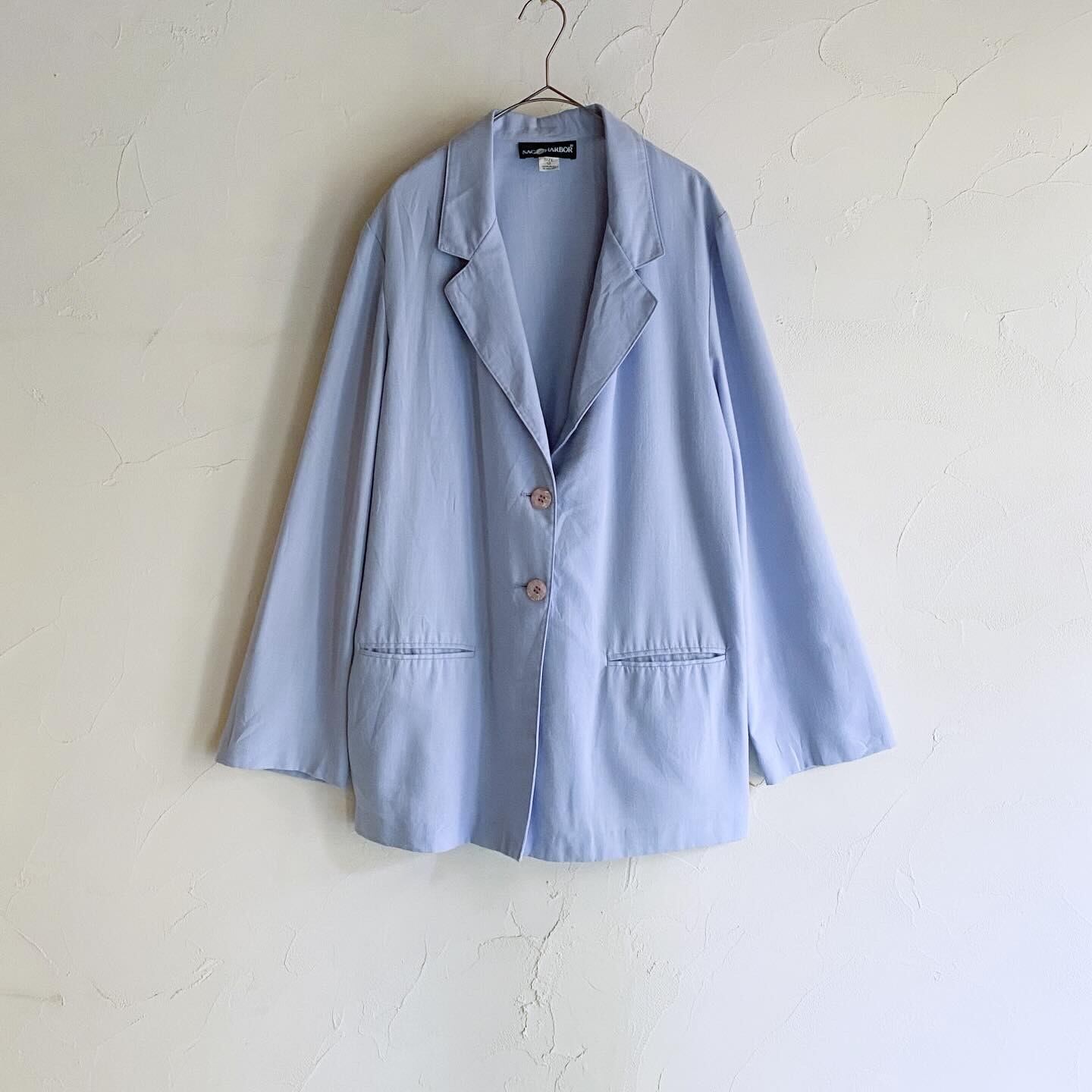 淡めなパープルカラーが目を惹くテーラードジャケットです。カジュアルにもフォーマルにも使える一着です。
