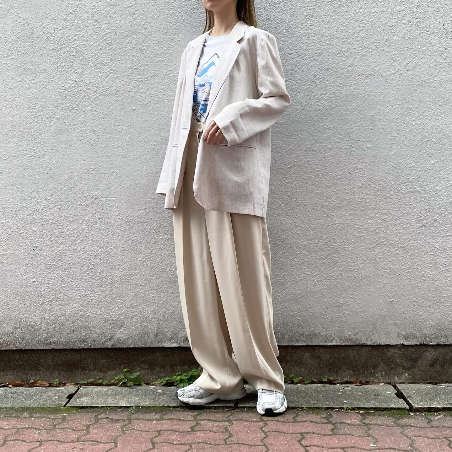 裏地が無く肩の落ち感が綺麗なテーラードジャケットです。春らしいアイボリーカラーが何にでも合わせやすい一着です。