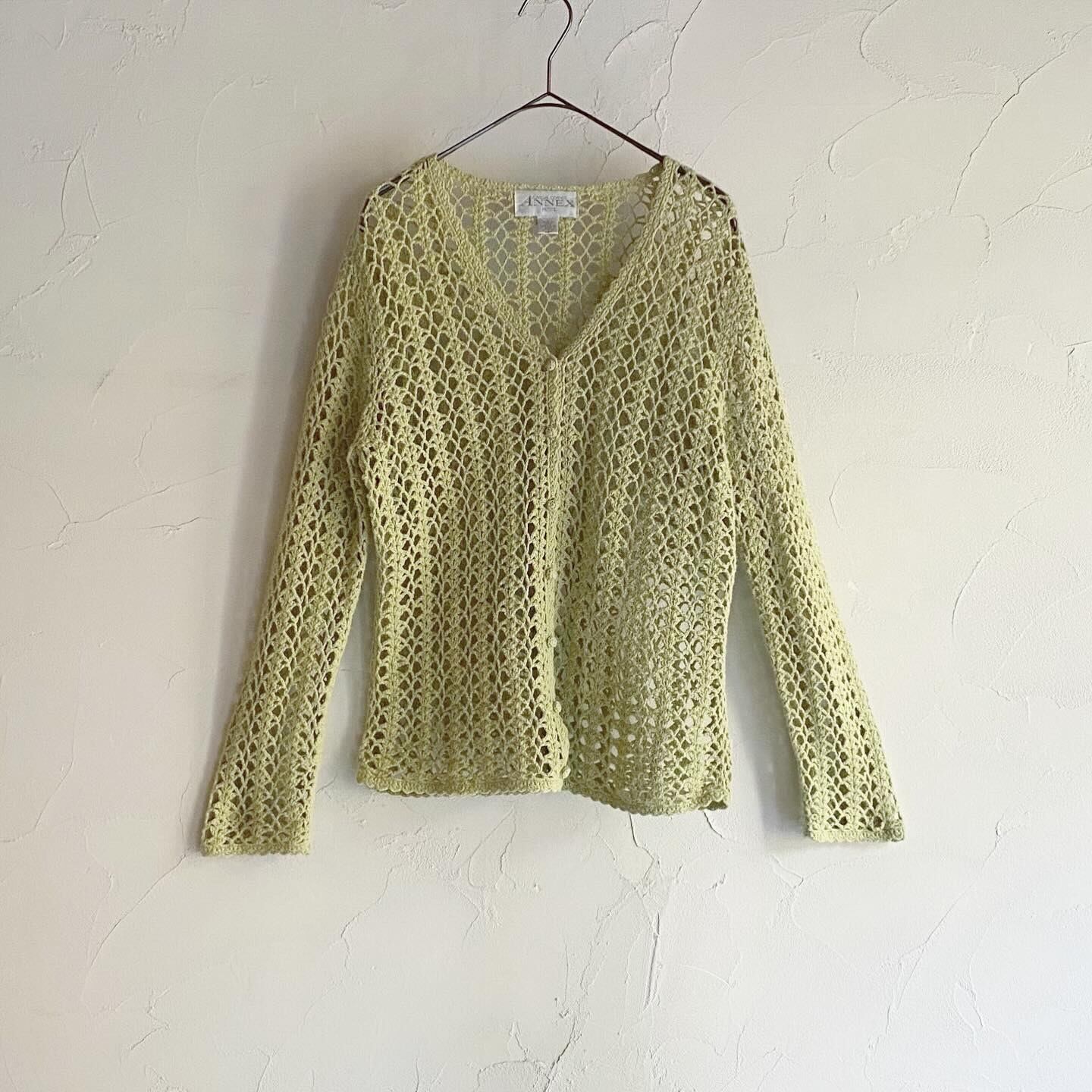軽やかなライトグリーンが春らしいクロシェカーディガンです。首元がざっくり空いているのでスカーフを巻いてあげるスタイリングもおすすめです。