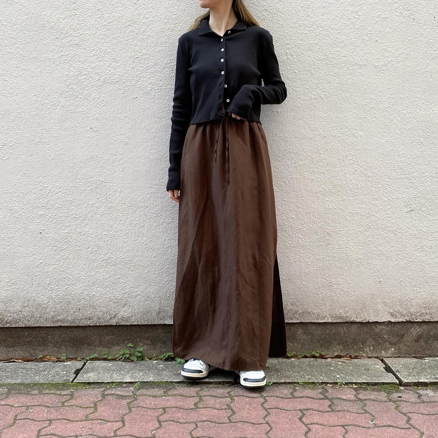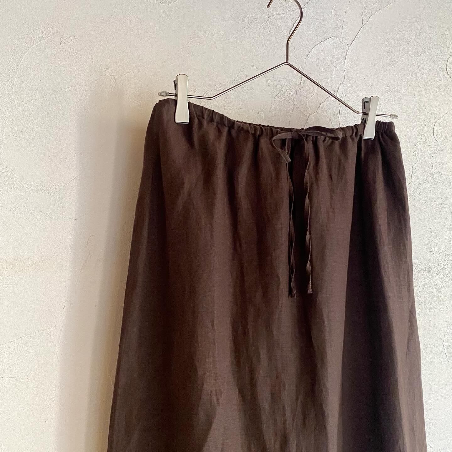 こっくりしたブラウンカラーが素敵なリネンスカートです。スリットが入っているので重くなりすぎず、これからの季節にさらっと着こなして頂けます。