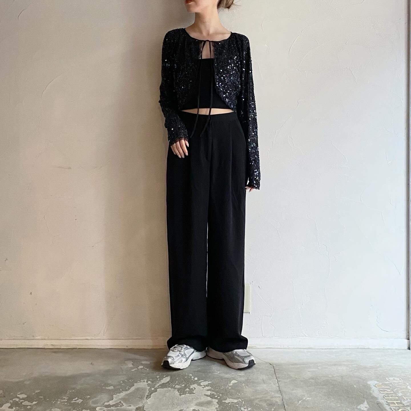 ビーズとスパンコールがふんだんに施されたクロップドカーディガンです。シアー素材に縫い付けられている為透け感があり、切りっぱなしのデザインも素敵です。