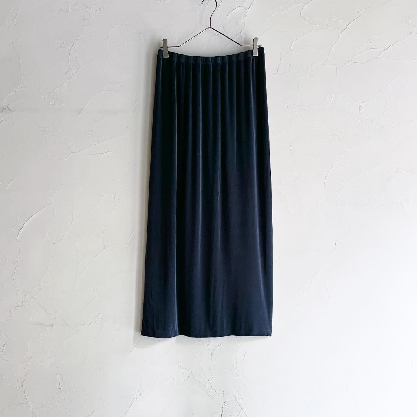 程よい光沢感が美しいスパンデックス混のスカートです。ブルーのようなグリーンのような絶妙な色味で、雰囲気のある一着です。