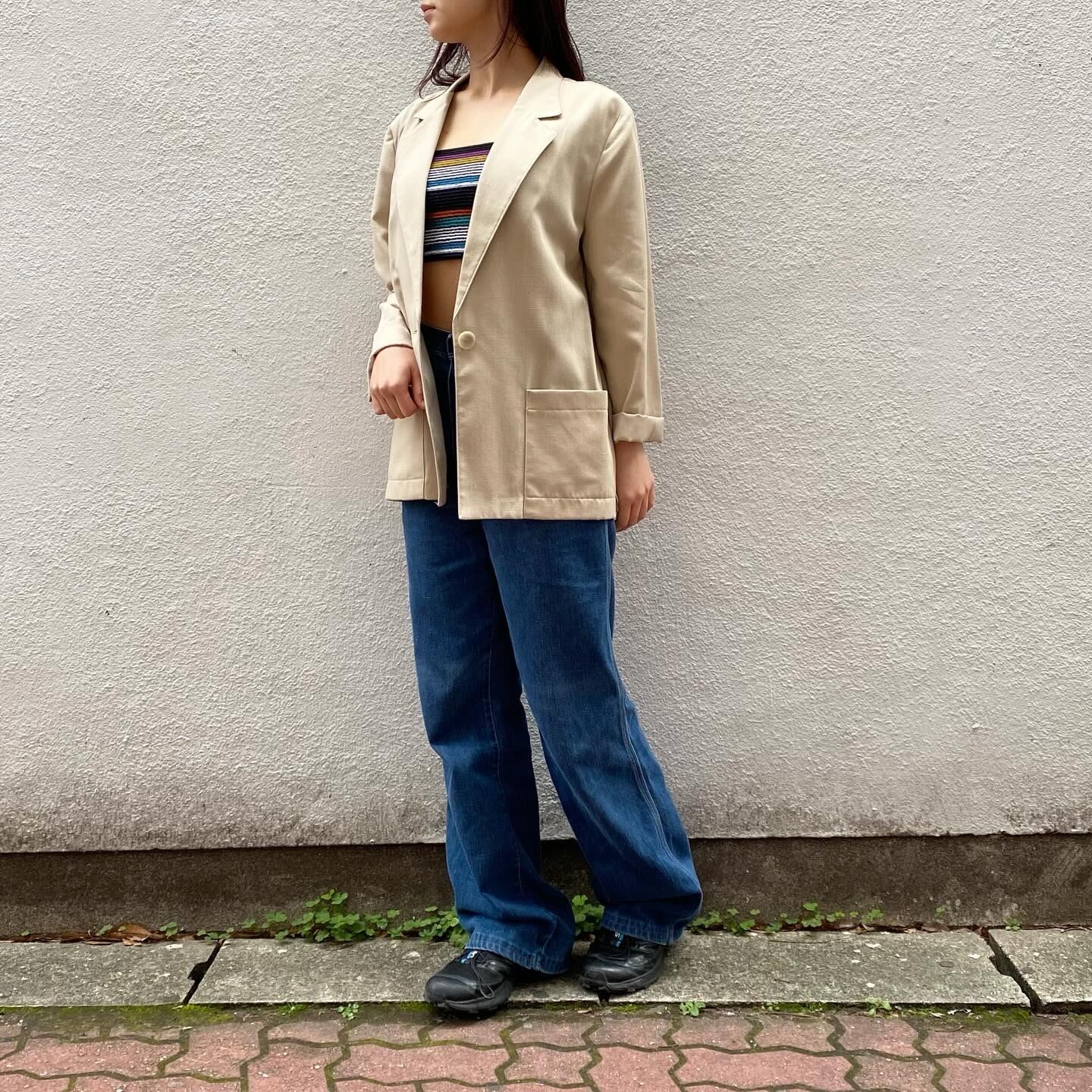 ベージュ生地にワンポイントのシェルボタンが可愛いジャケットです。