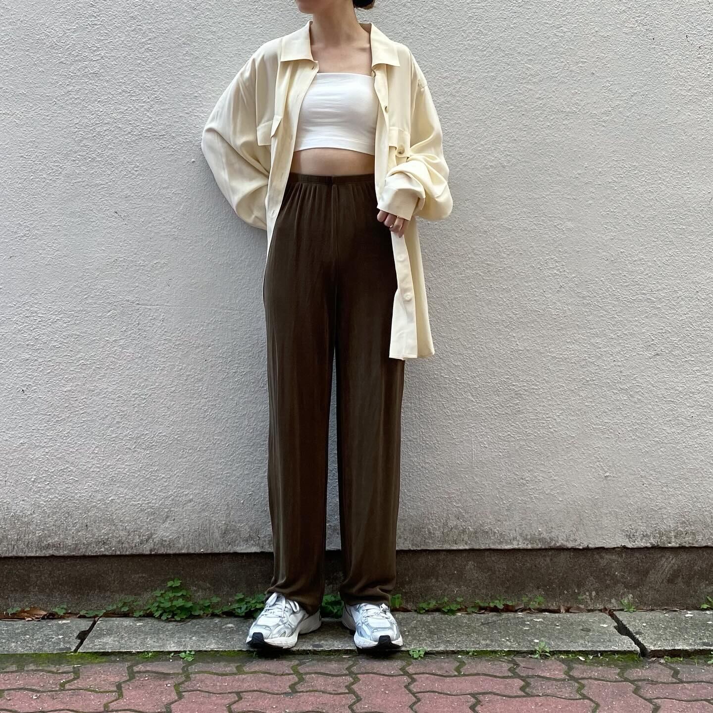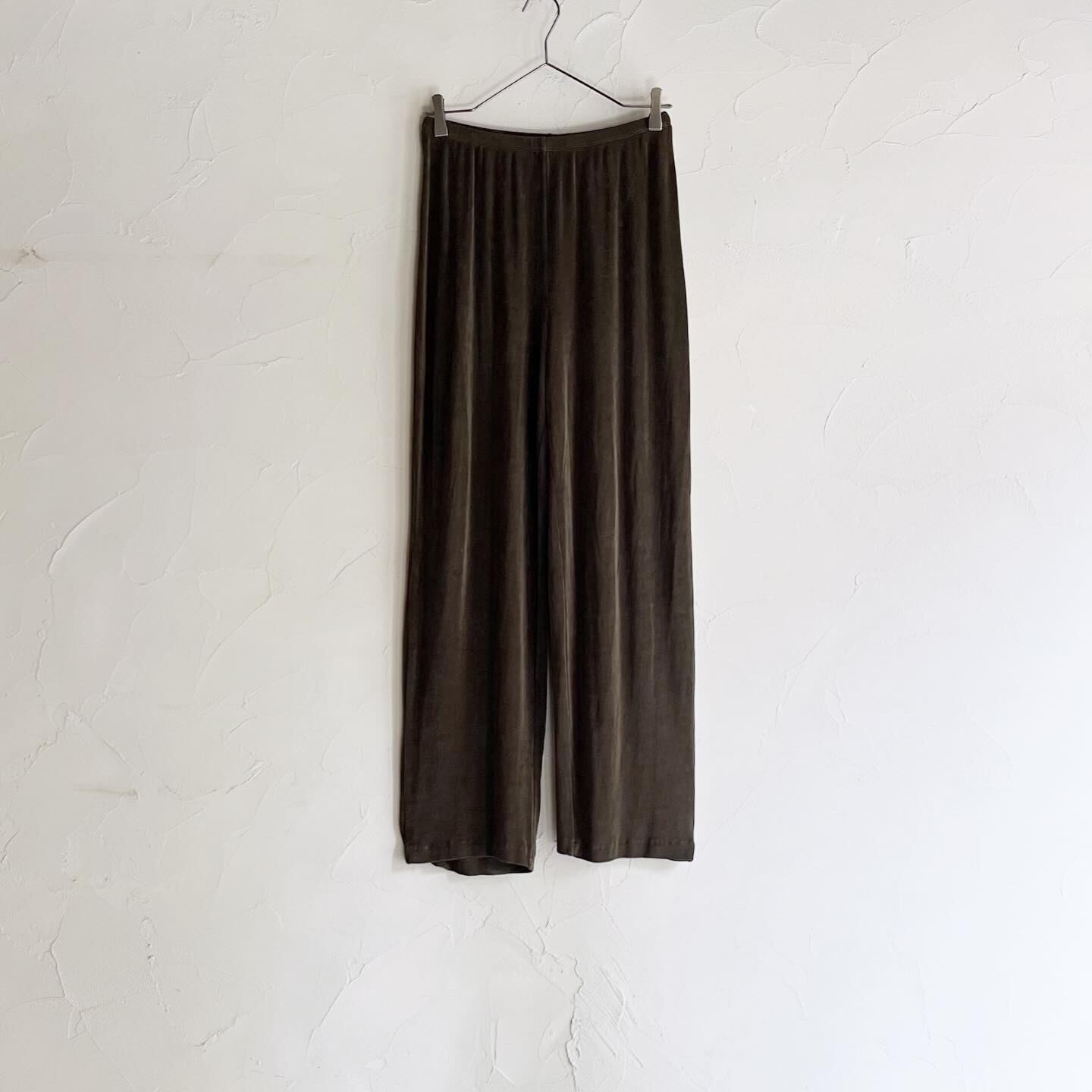 程よい光沢感のあり、絶妙なカーキが美しいイージーパンツです。スパンデックス混で伸縮性があり、ラフにお召し頂けます。
