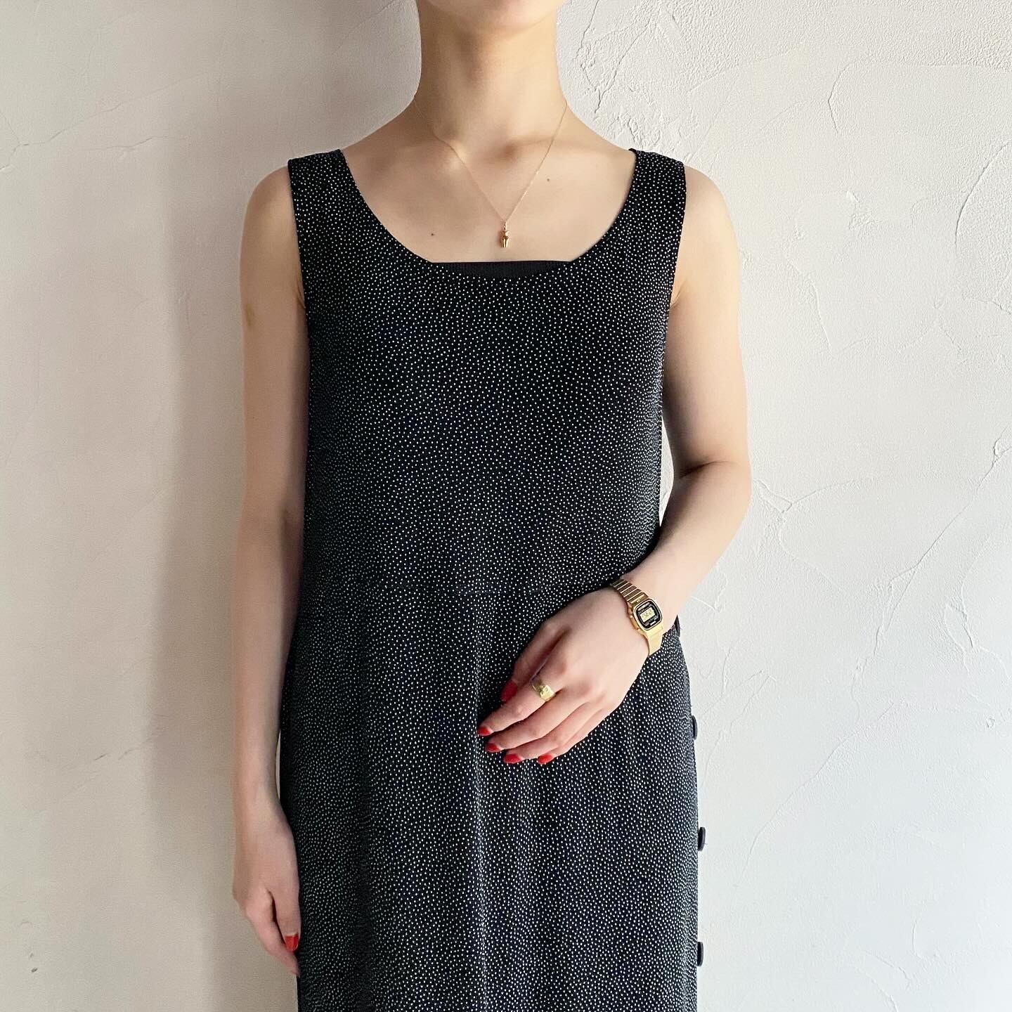 細かいドットや、サイドの7つのボタンが可愛いワンピースです。スパンデックス混で、伸縮性のあるサラッとした生地感です。