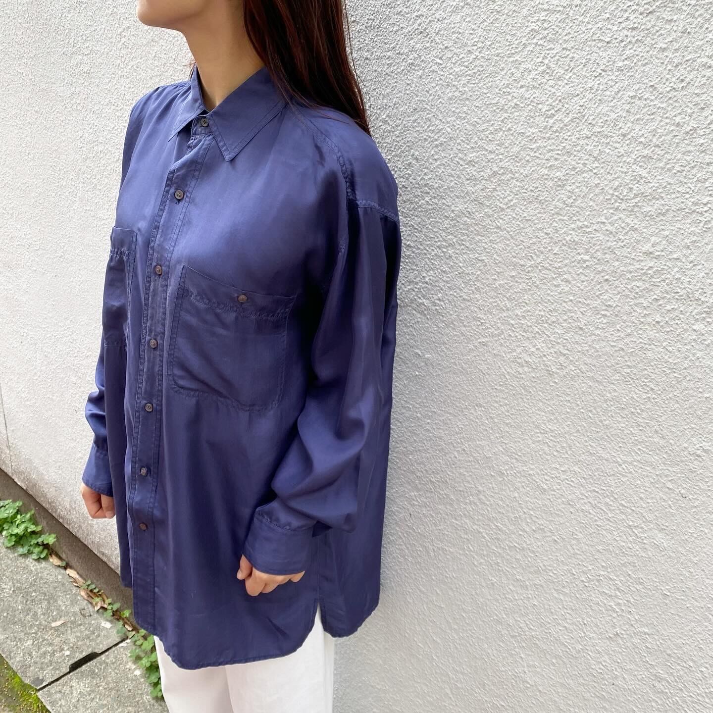 100%シルクでネイビーの程よい光沢感が美しいシャツです。ゆったりとしたサイズ感で、羽織りとしても可愛いです。