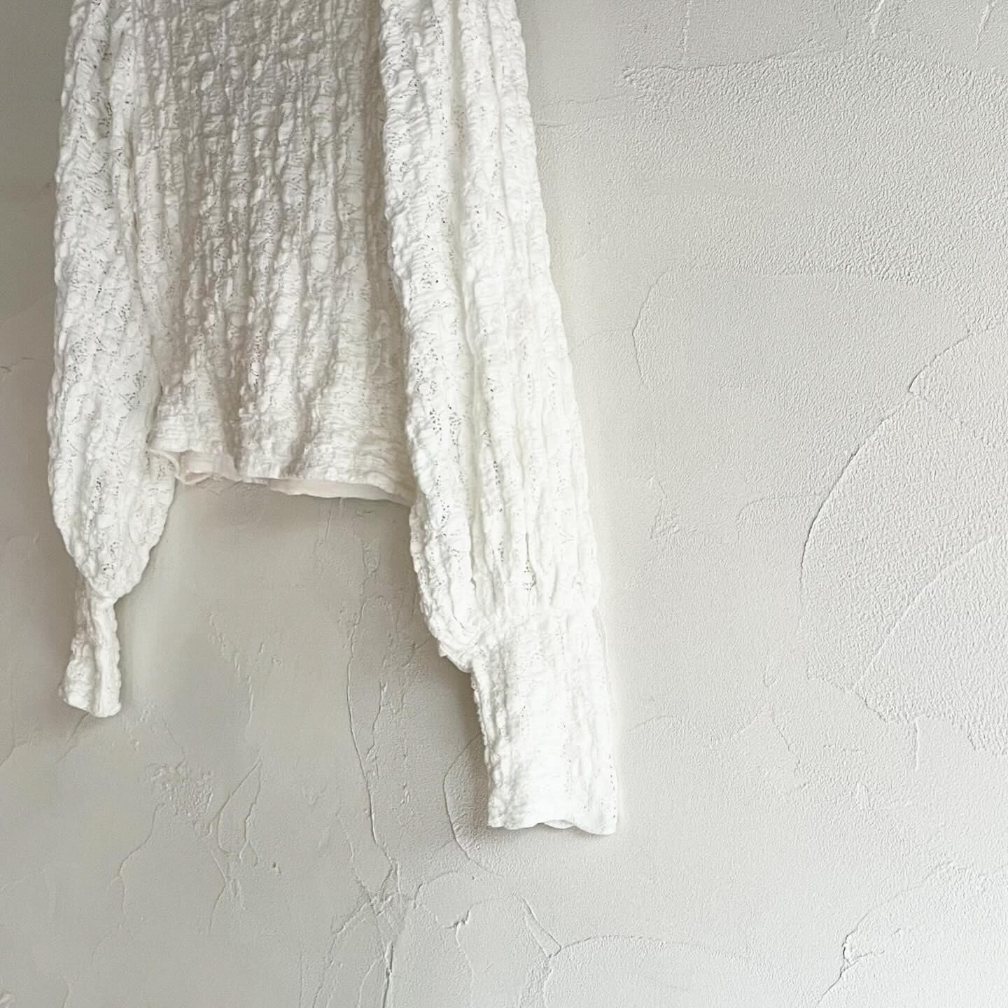 丸みのある袖や、バックが開いたデザインが可愛いトップスです。お花の総レースで、身頃の部分には裏地が着いているので透けないです。