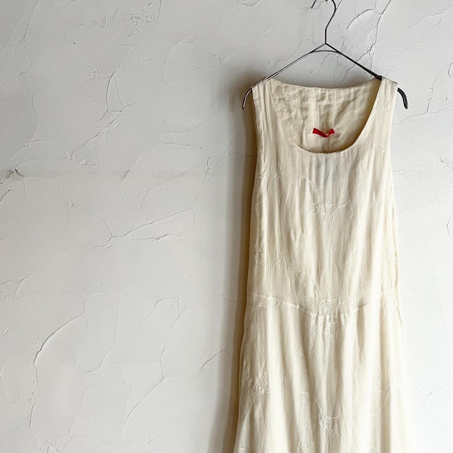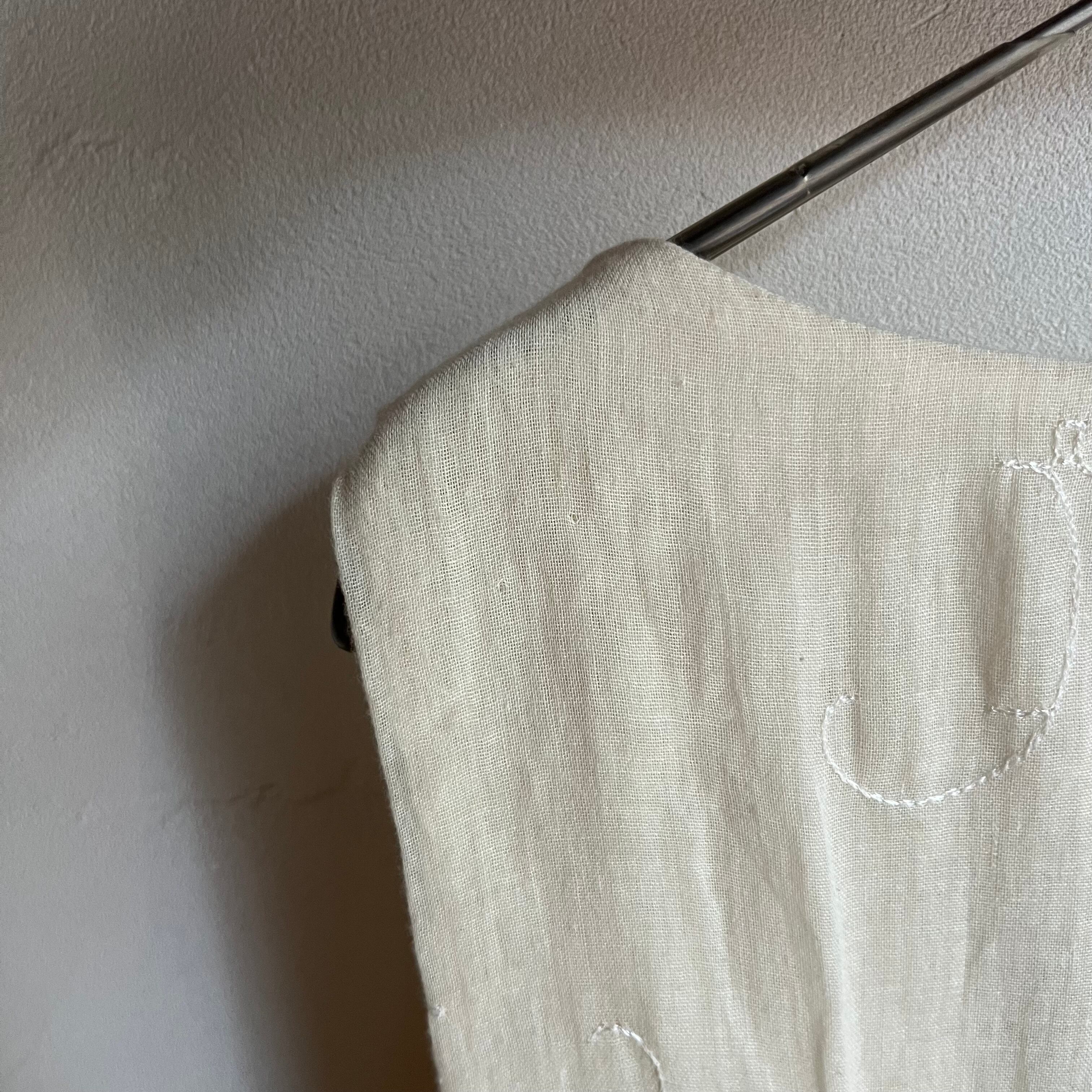 ガーゼのような生地感で、アイボリーにホワイトの刺繍が柔らかい印象のワンピースです。