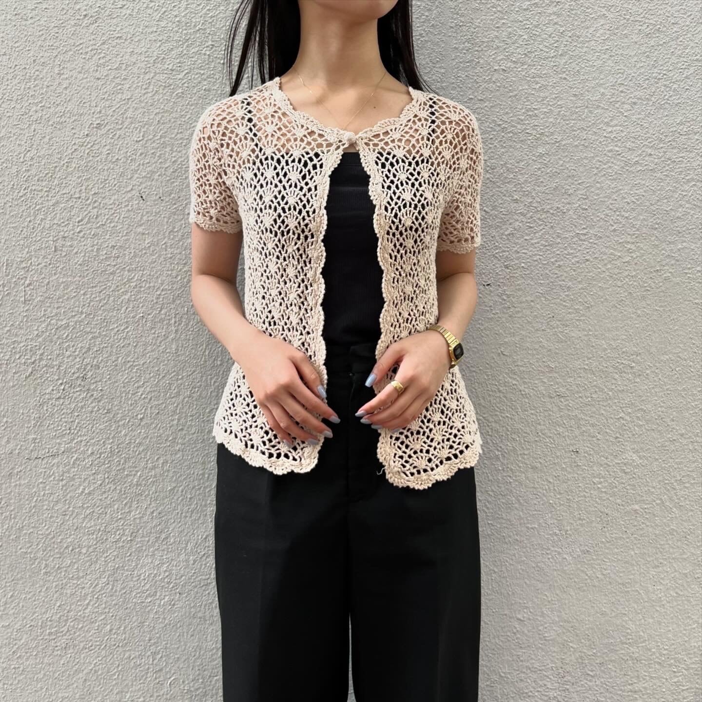 裾のひらひらとしたデザインが可愛いクロシェカーディガンです。身体のラインに沿った、柔らかく着心地の良い一着です。