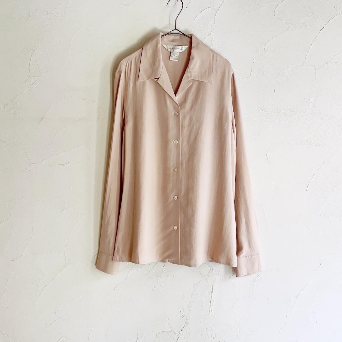 優しい桃色の生地とシェルボタンが可愛らしいシルクシャツです。襟元の裏にあるループボタンを閉めるとシャツ寄りに、開けるとジャケット寄りにお召しいただけます。