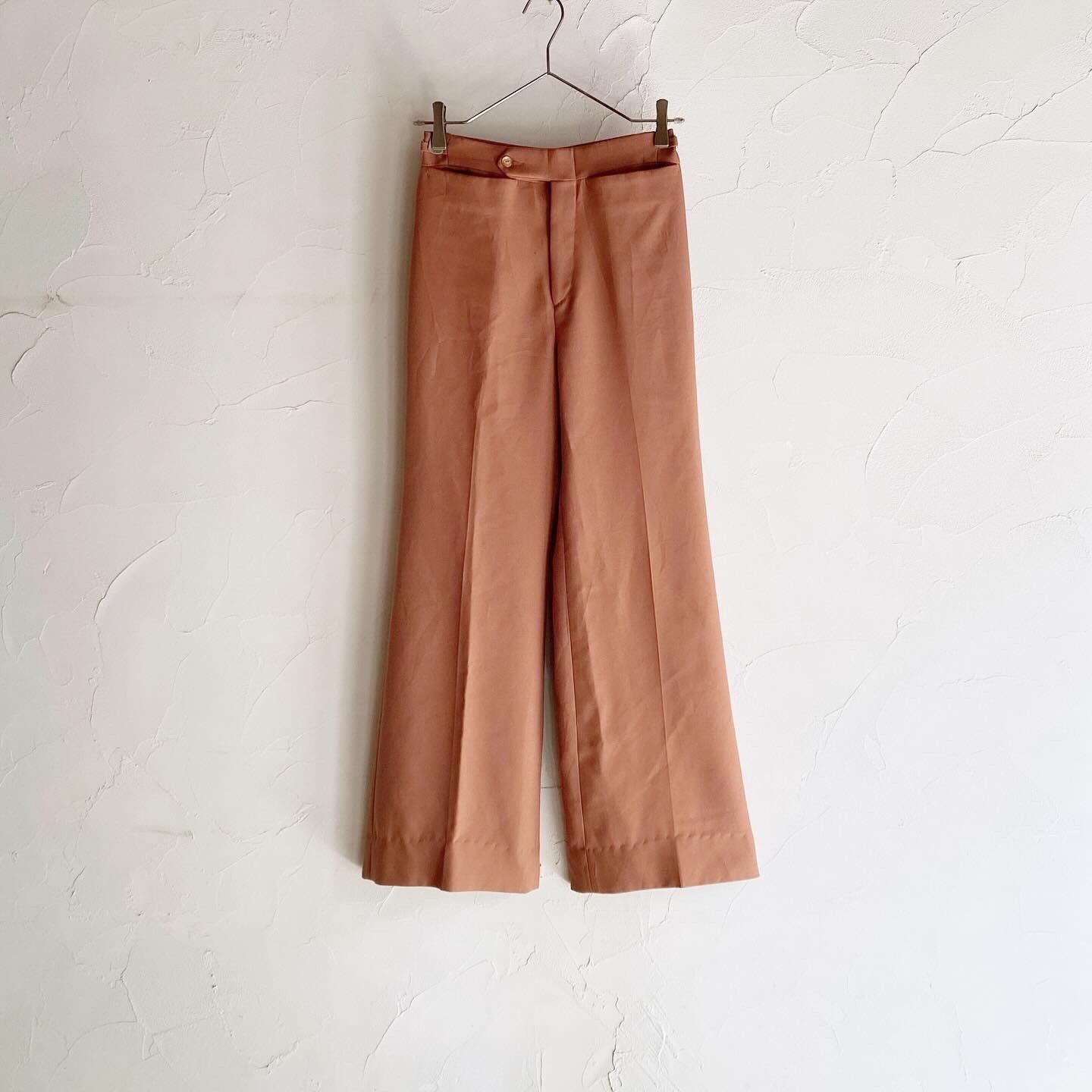 センタープレスでシルエットが綺麗な年代古めのフレアパンツです。表記はありませんが、おそらくポリエステル製で透け感なくお召し頂けます。