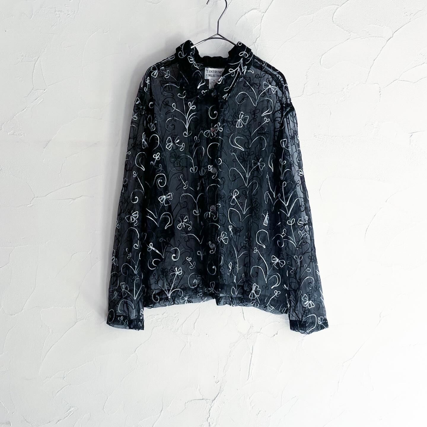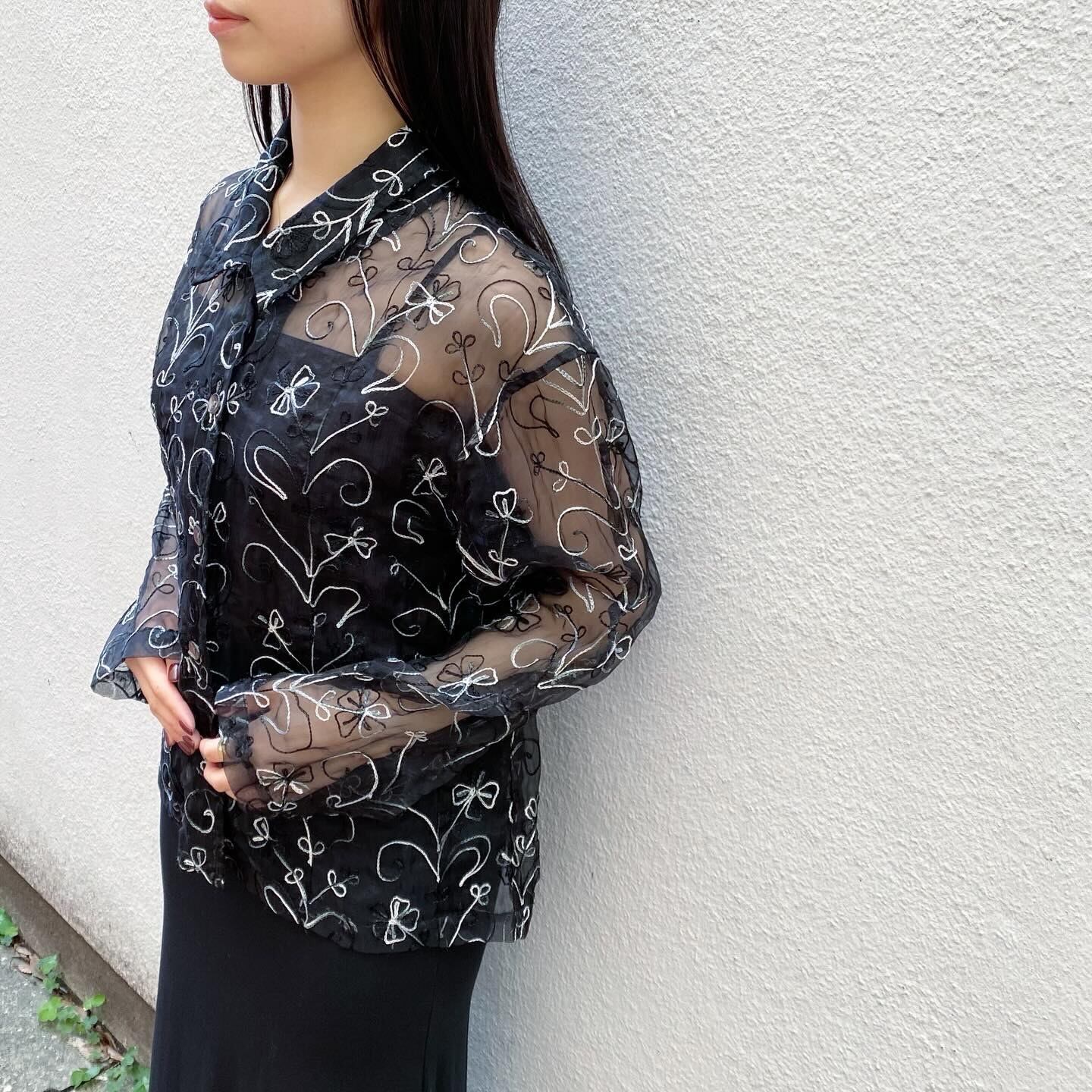 全体に施されたブラック、グレー、ホワイトの刺繍が素敵なシアーシャツです。シルク混で程よい光沢感があります。