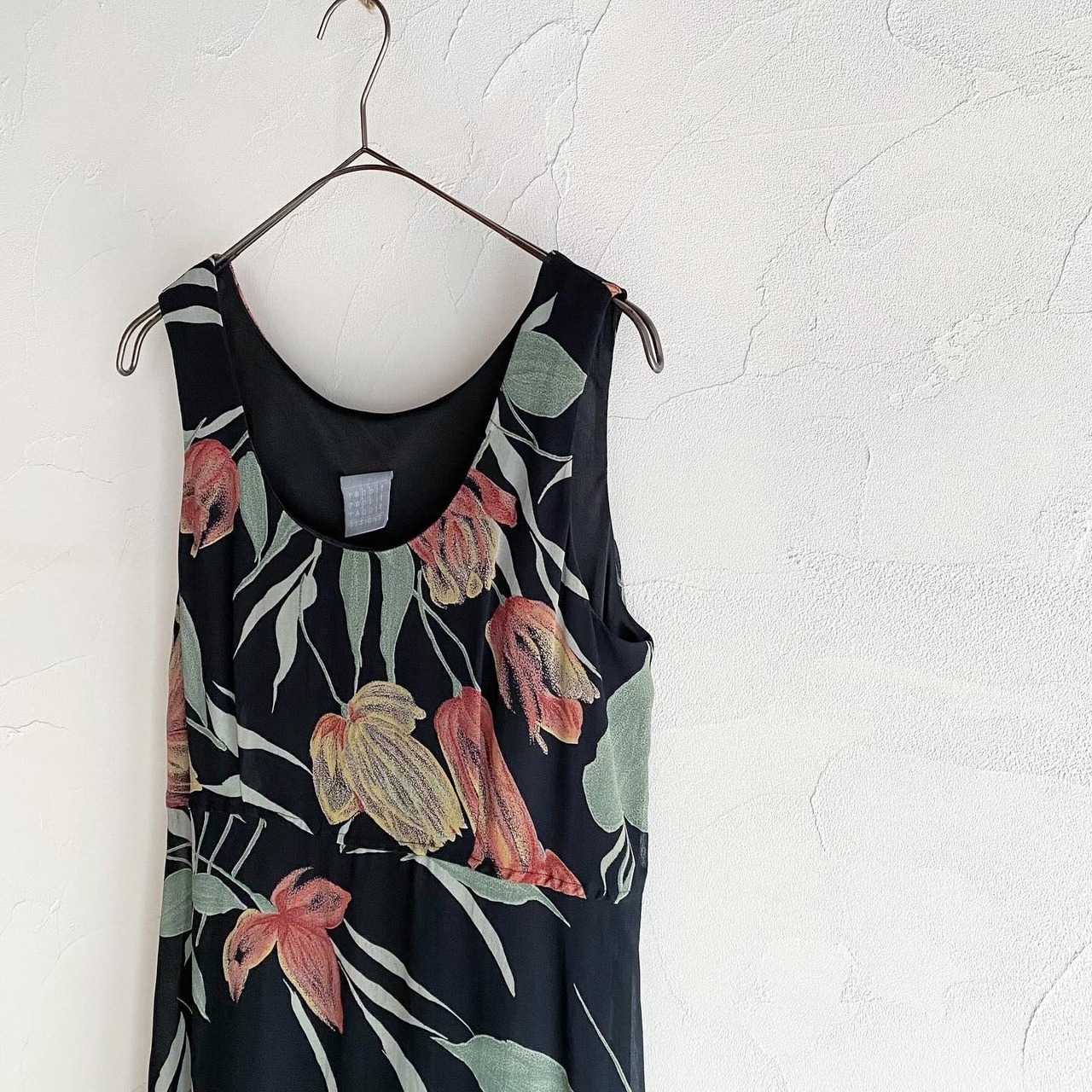 落ち着いたカラーリングのチューリップ柄のワンピースです。ストンとしたデザインと切り返しが上の位置にあるため、着た時のシルエットが美しいです。裏地が付いているため、1枚でさらっとお召し頂けます。
