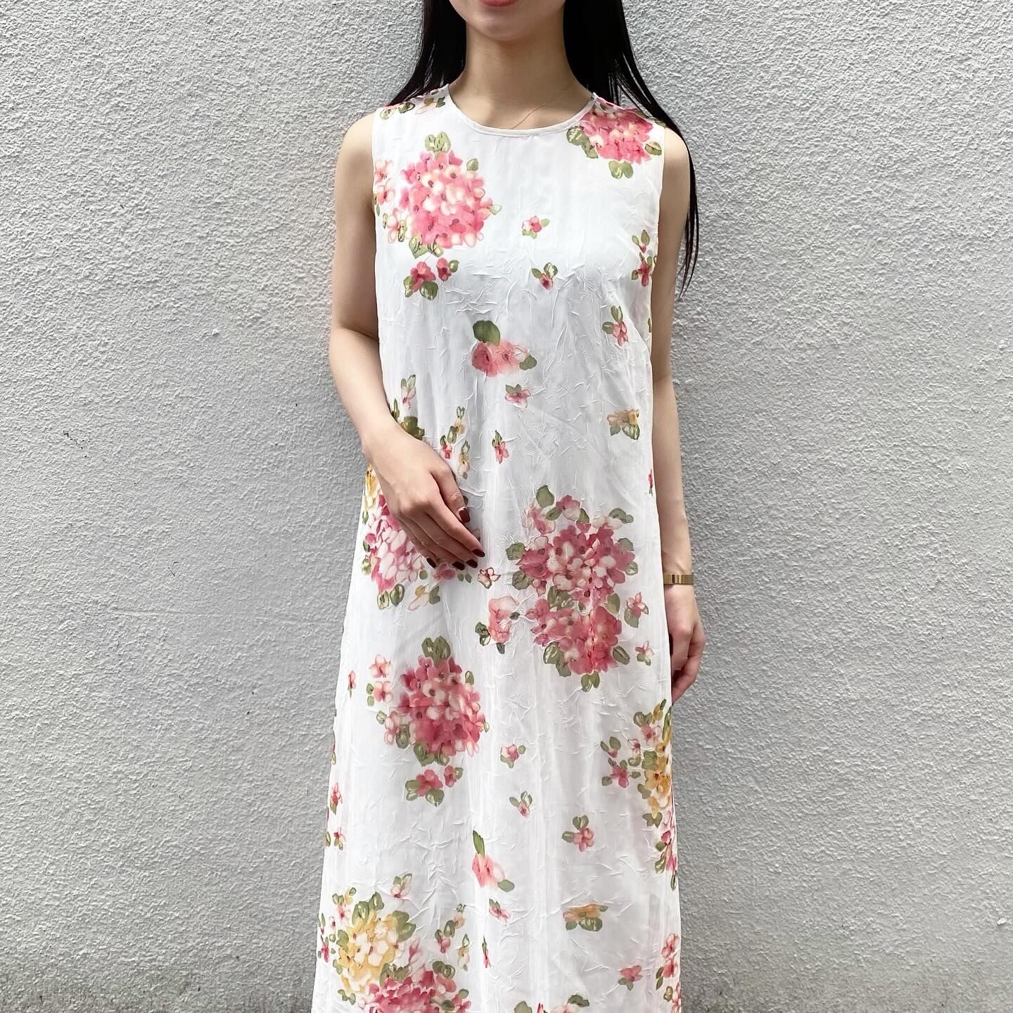 ピンクとオレンジの大きな紫陽花が可愛いワンピースです。透け感のあるシアー生地に、さらっとした裏地が付いています。